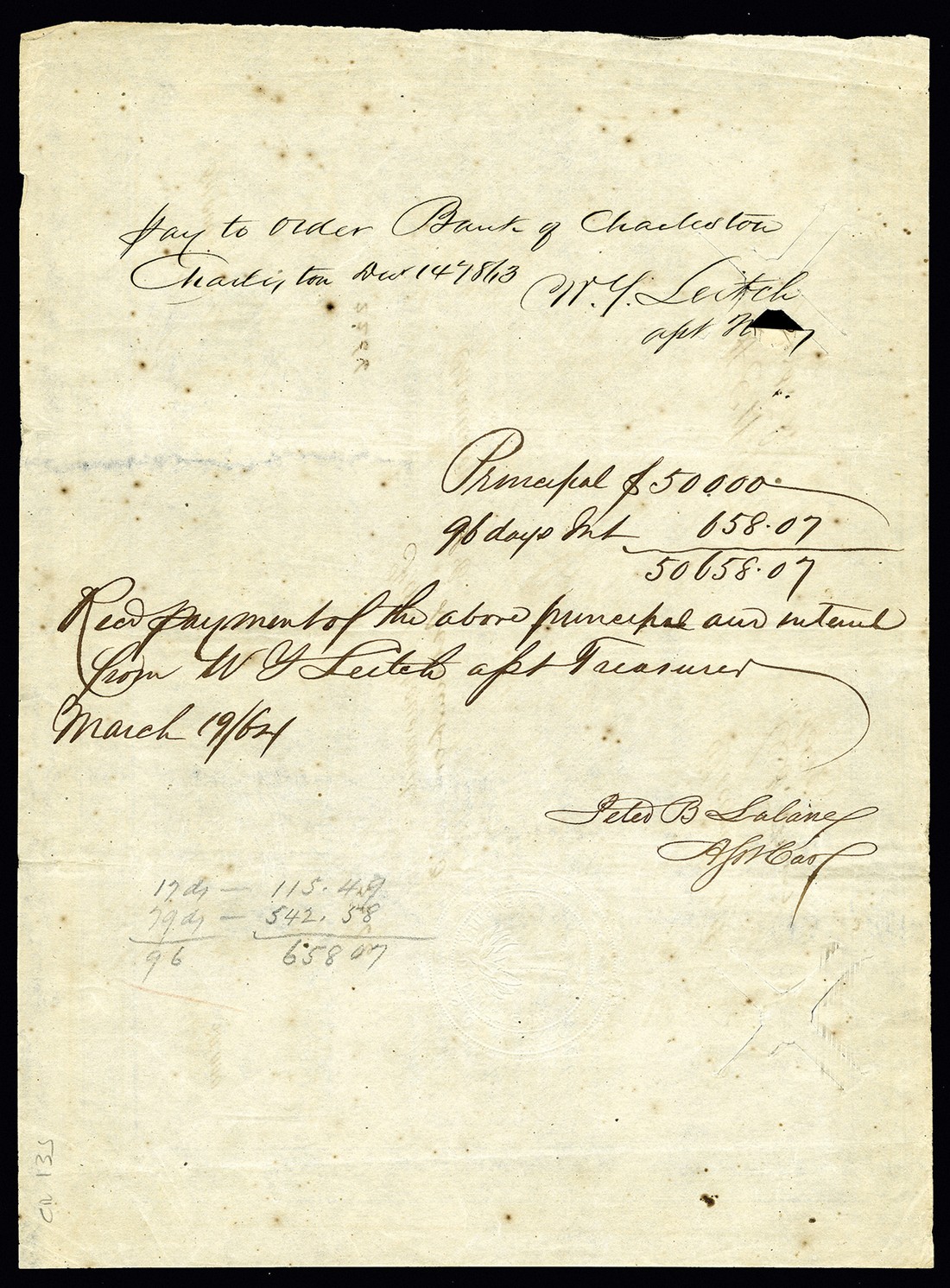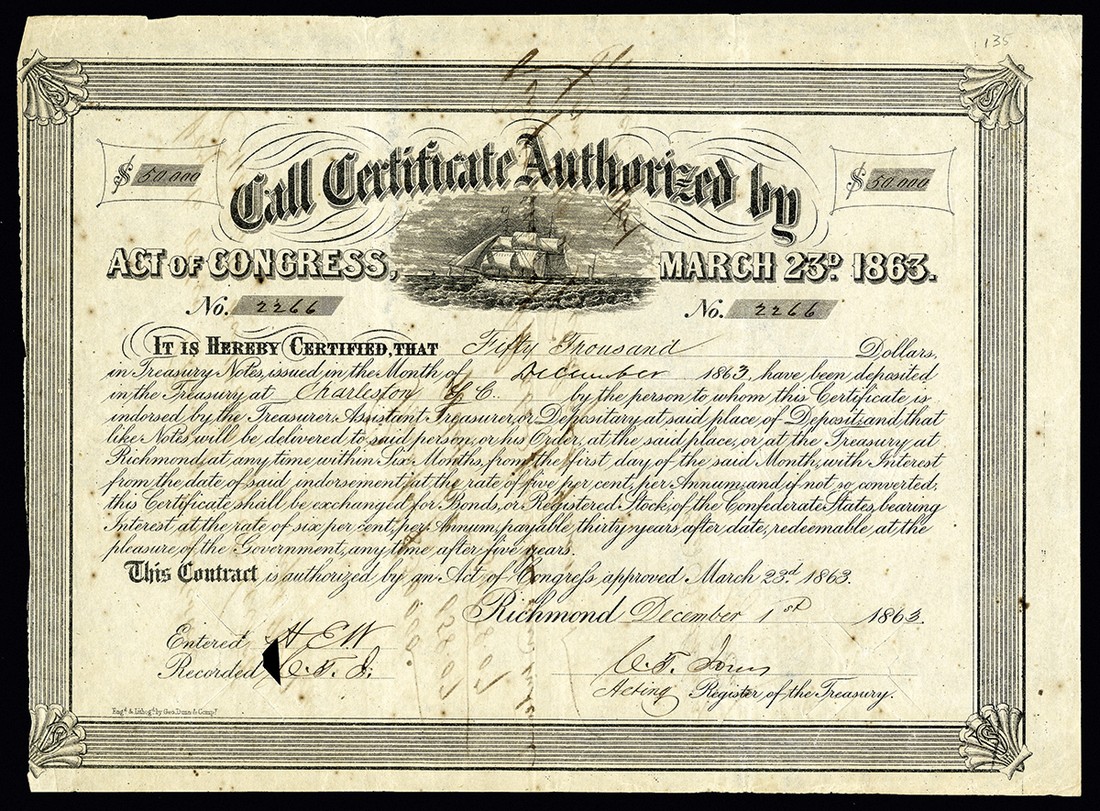 CSA. $50,000. Ball 275. Cr.135. 1863. 5% Call Certificate. Charleston. Signed by Jones (Ball reports Tyler only). VF, hammer cancelled with a small chip out of the lower left signature block, and some bleed through from back endorsements. Rarity 8 per Fricke.