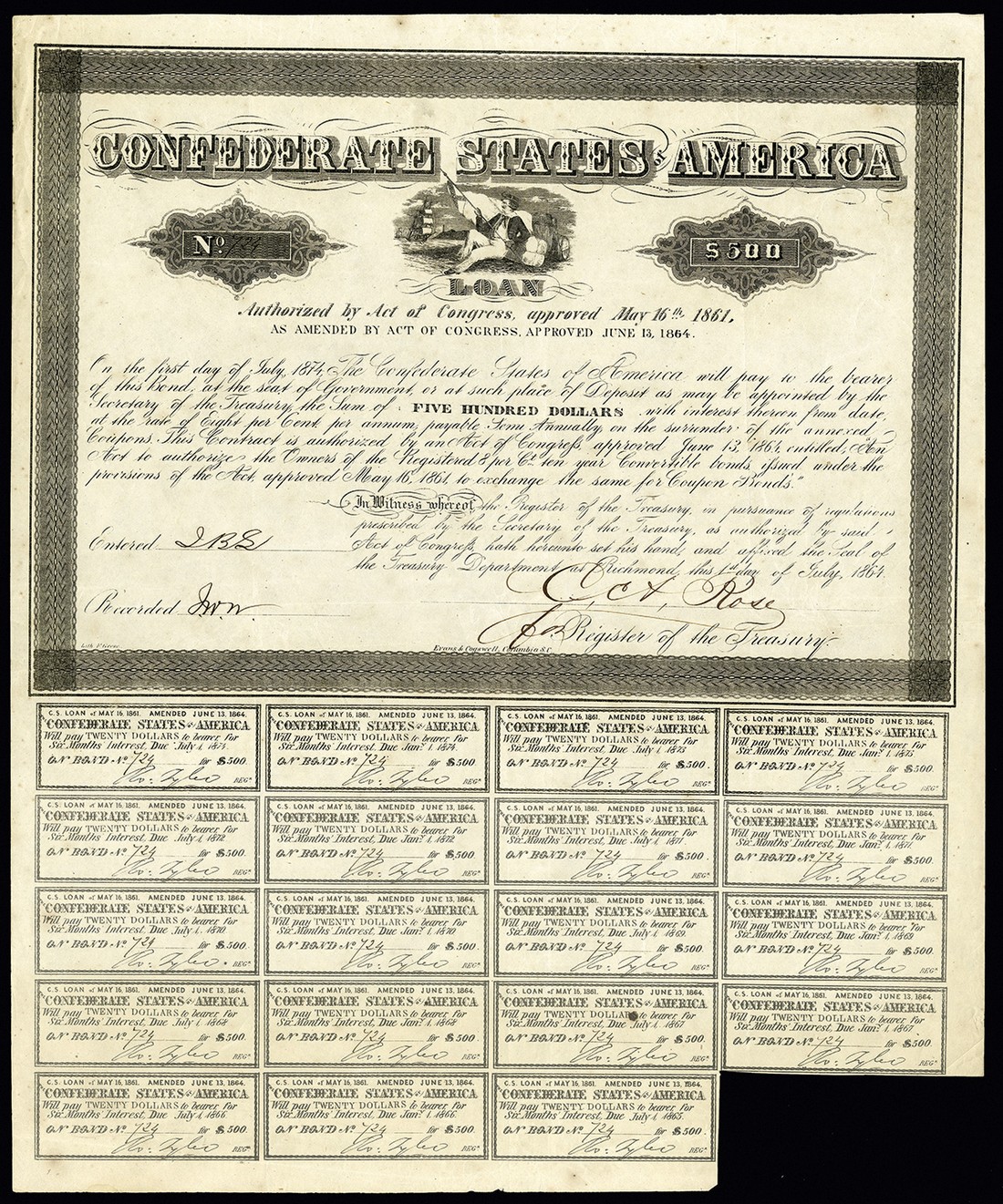 CSA. June 13, 1864. $500. Ball 383. No.724. Sailor and flag. Ball reports that the bonds in this serial number range are falsely filled in remainder. R-10. Rose. 19 coupons. VF-EF. Very attractive.