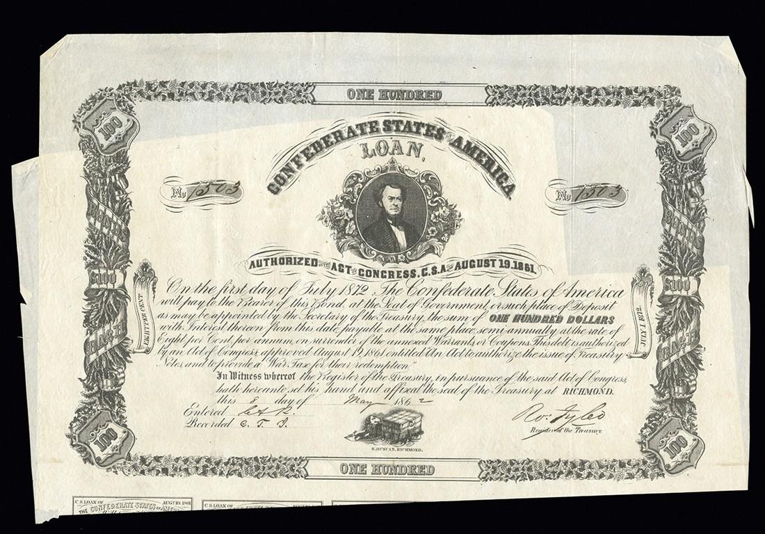 CSA. Act of August 19, 1861. $100. Ball 72. Cr. 34. Mallory. Tyler. No.1503, 1488,1545, 1500, 1485, 1513, 1247. 19 coupons. VF+. All are fresh and bright, but one has some stains in the top margin. [7]