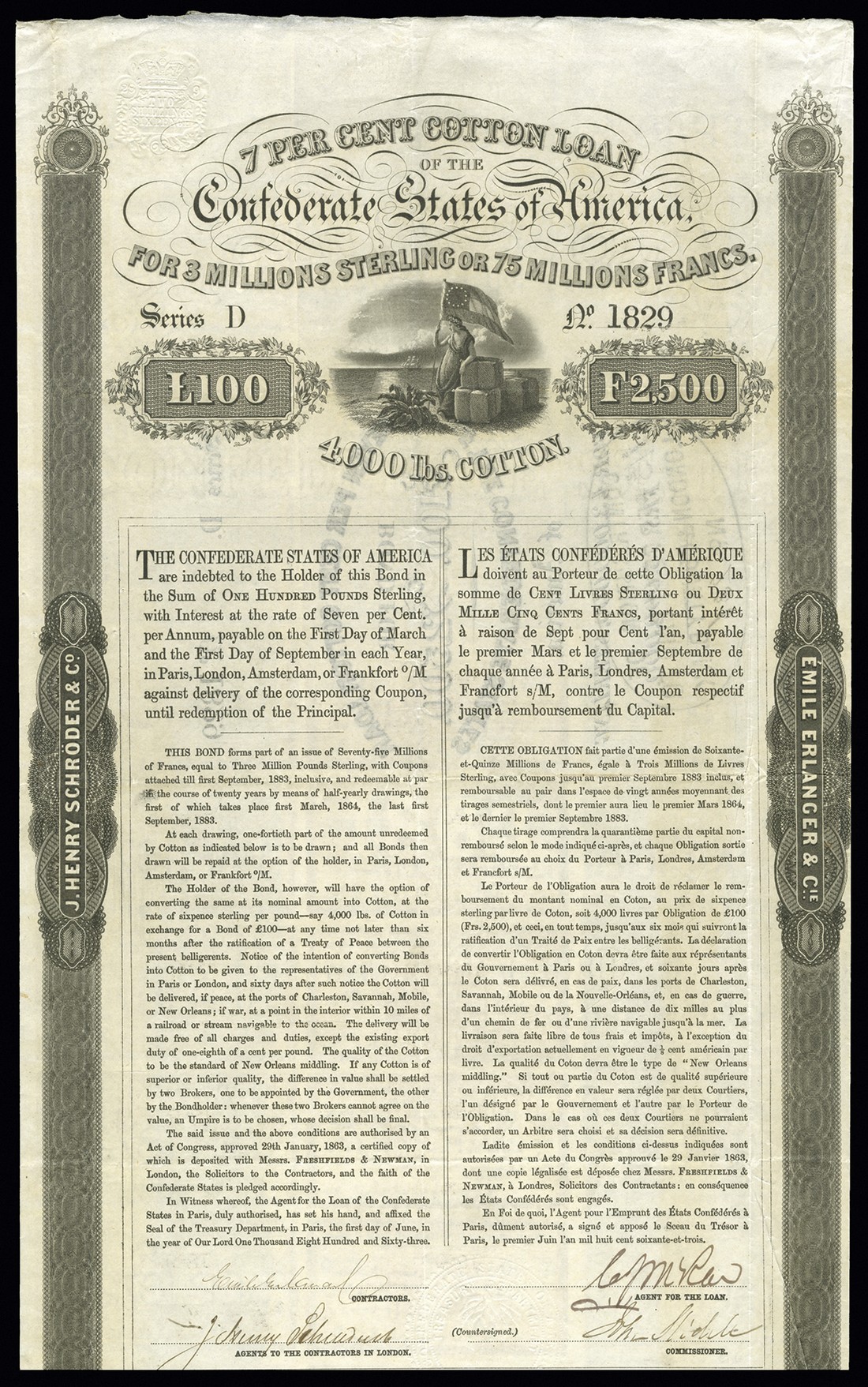 CSA. Act of January 29, 1863. $100 Pounds. Ball 156. Cr. 116. Ehrlanger bond. Woman with Confederate flag. Slidele. No.1829. 36 coupons. VF-EF. A premium quality example of this very popular bond.