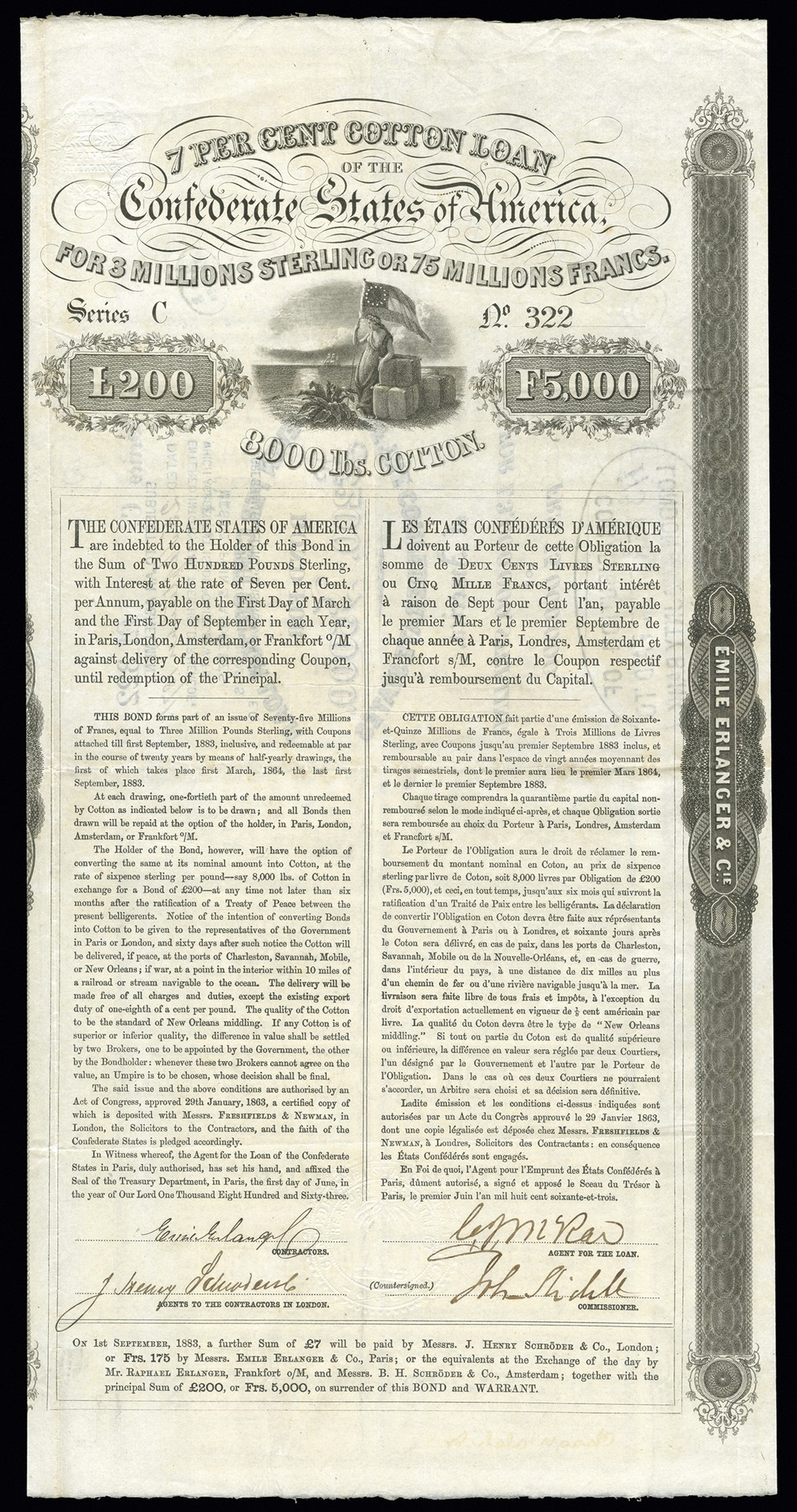 CSA. Act of January 29, 1863. $200 Pounds. Ball 157. Cr. 117. Ehrlanger bond. Woman with Confederate flag. Slidele. No.322. 36 coupons. VF-EF. A premium quality example of this very popular bond.
