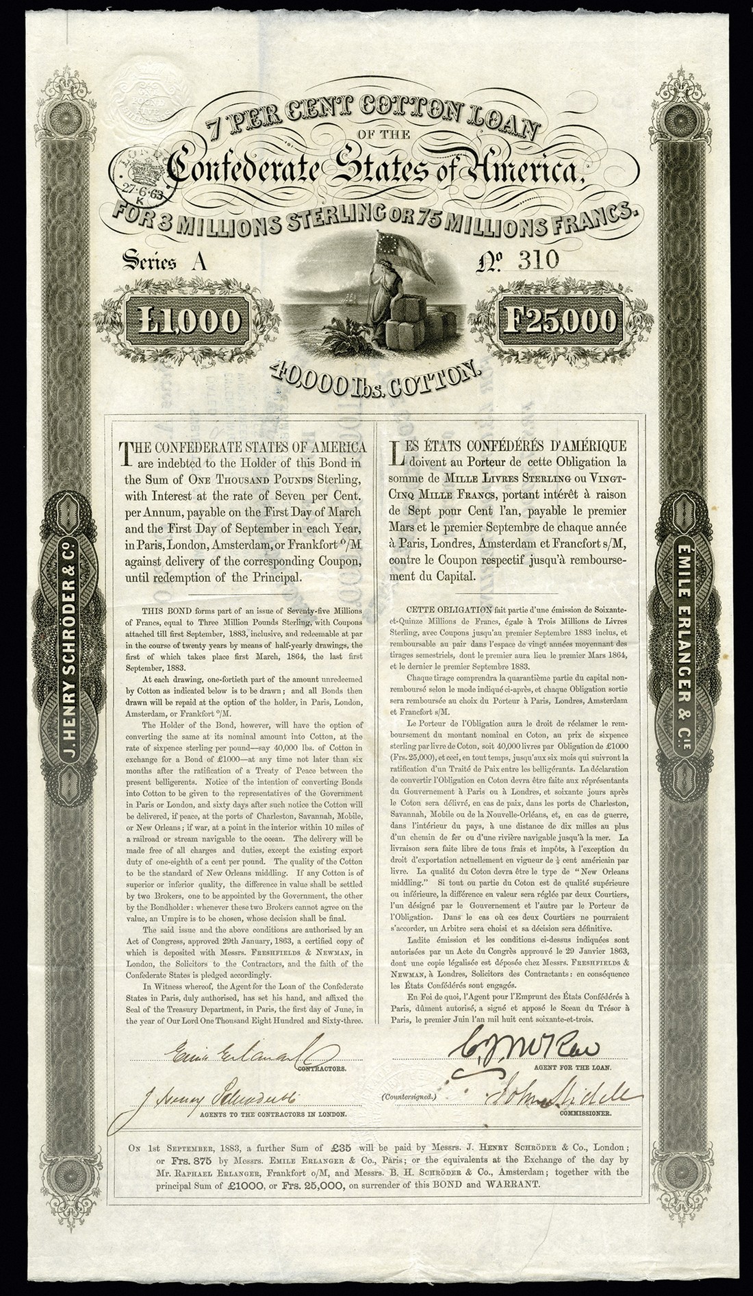 CSA. Act of January 29, 1863. $1000 Pounds. Ball 160. Cr. 119. Ehrlanger bond. Woman with Confederate flag. Slidele. No.310. 36 coupons. VF-EF. A lovely example of this scarcer, higher denomination bond.