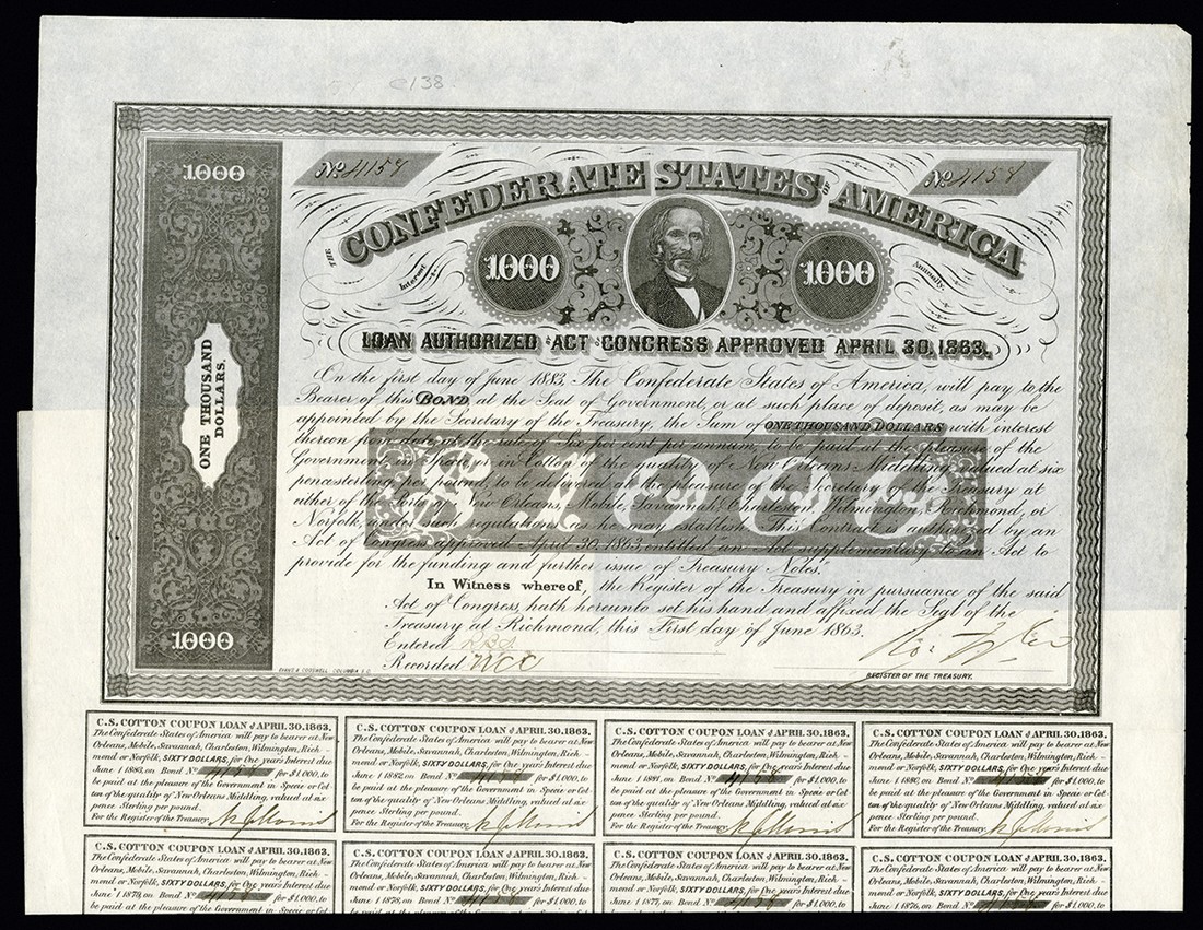 CSA. Act of April 30, 1863. $1000. Ball 280. Cr. 138. Seddon. Tyler and Jones. No. 18 coupons. VF+. Most are very presentable examples of this bond that often is encountered on very brittle paper. Three or four have some stains or other minor problems in the margins. [24]