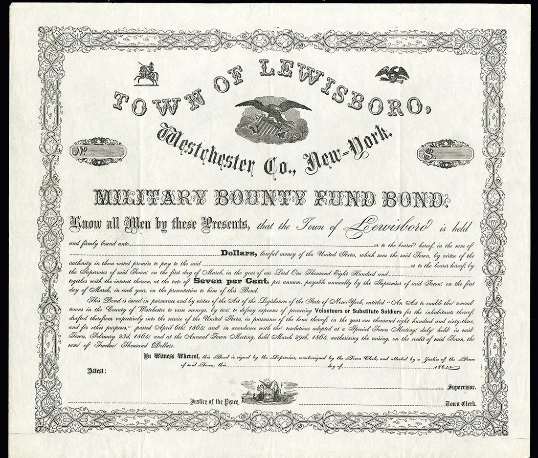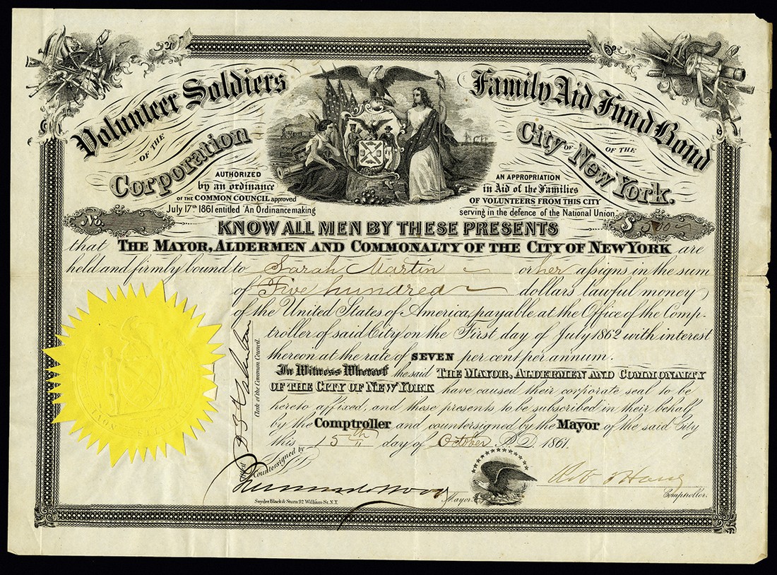 New York Bond Trio. 1) Goshen. Goshen & Deckertown Railway Company. $500. 1868. Red $500. AU remainder. 2) Town of Lewisboro. Westchester County. Military Bounty Fund Bond. 1864. AU remainder. Minor edge split. 3) New York City. Volunteer Soldiers Family Aid Fund Bond. $500. 1861. Signed by Mayor Fernando Wood, who proposed that New York secede from the Union. Yellow seal. EF. [3]