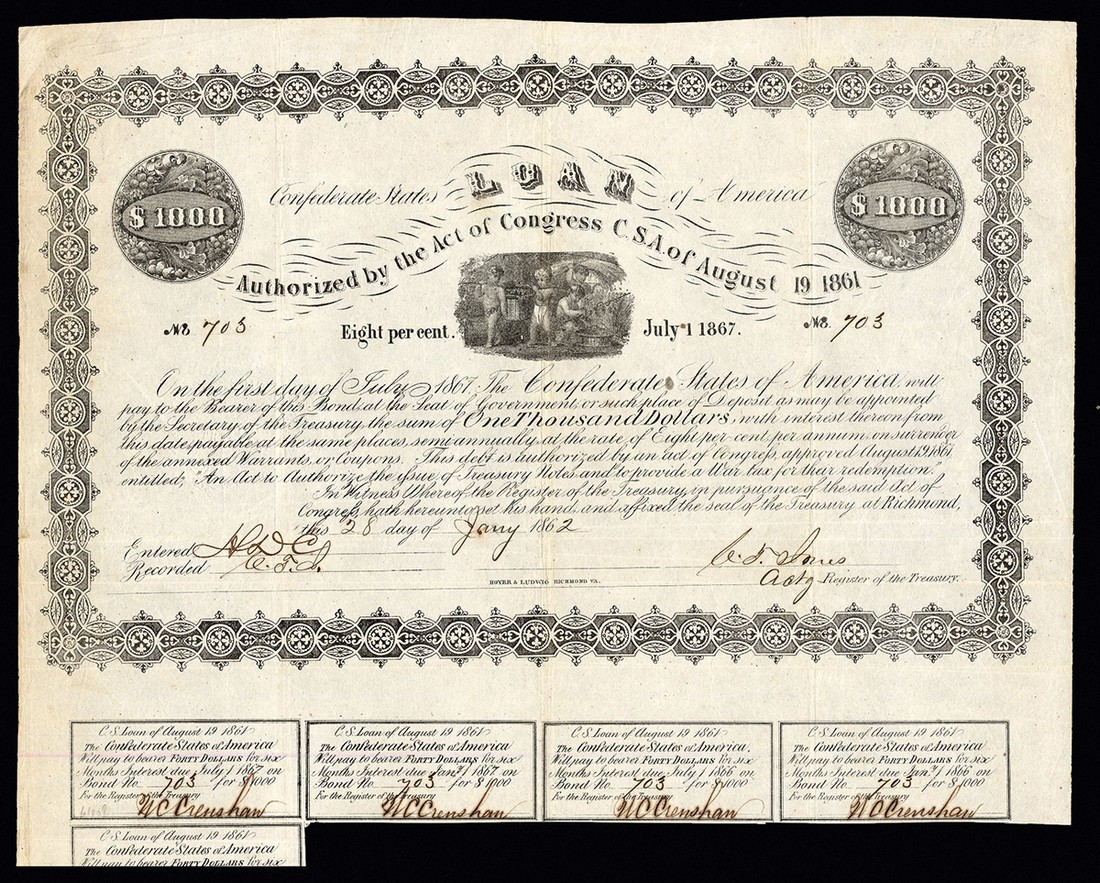 Act of August 19, 1861, 8% Loan, $1000 bond, redeemable July 1, 1867, 1199 issued, four children in centre, with coupons (Criswell 81), GF.