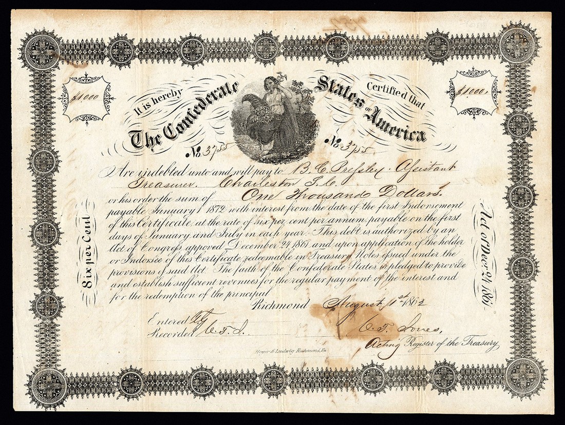 Act of December 24, 1861, 6% Loan, [$1000] registered bond, redeemable January 1, 1872, female figure in centre (Criswell 108), light stain bottom right, GF.