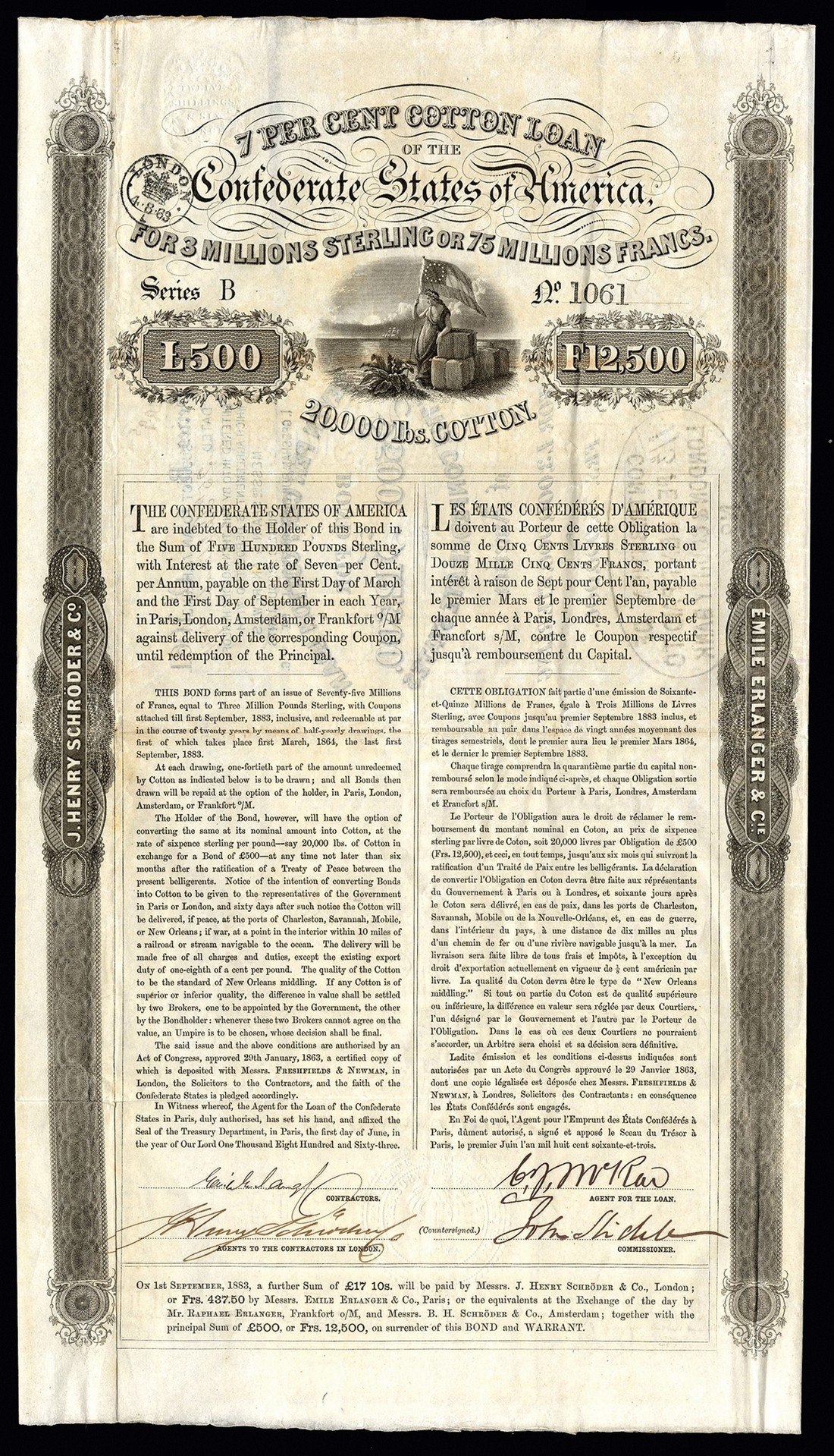 Act of January 29th 1863, 7% Cotton Loan, bond for £500, no.1061, signed by Emile Erlanger & Co. as contractors and J Henry Shroeder & Co. as London agents, allegorical female with flag and bales, text in English and French, black, orange underprint to coupons (Ball 158; Criswell 118), AVF.