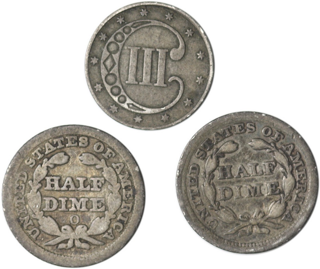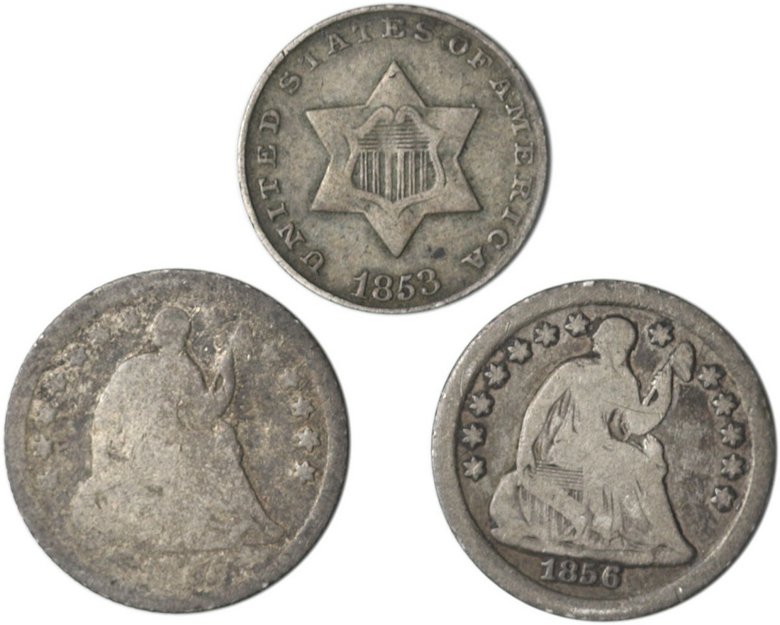 Silver Trio. 1853 Silver Three-Cent. VF-EF; 1855-O Arrows Half Dime. Fair; 1856 Half Dime VG. [3]