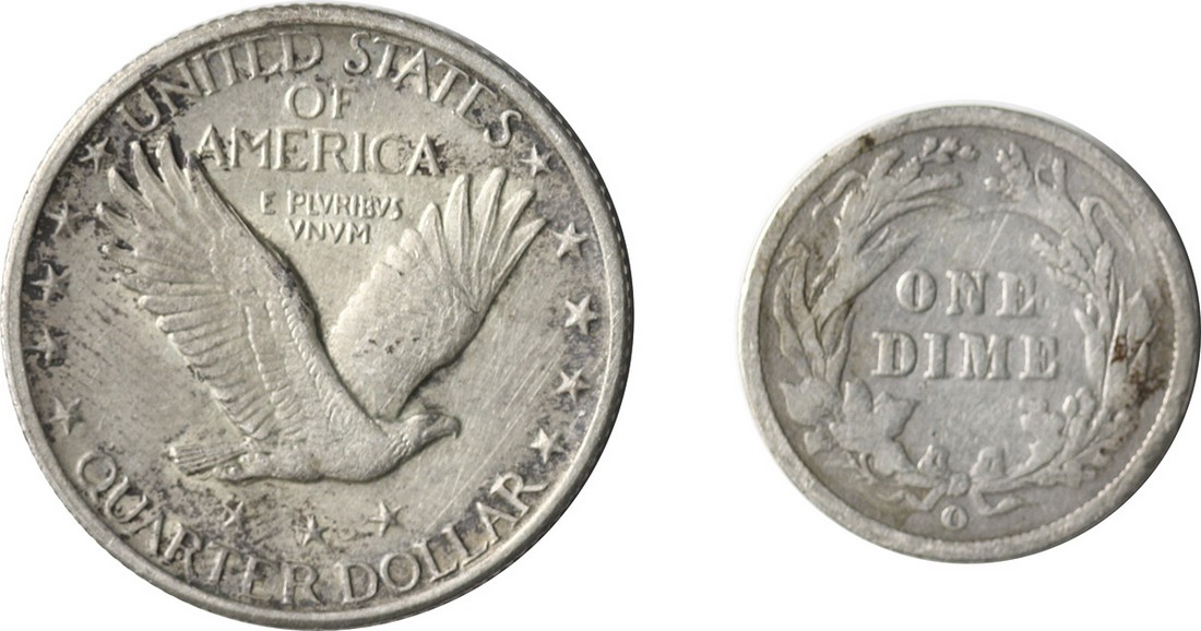 Barber Dime and Standing Liberty Quarter Duo. 1896-O Mercury Dime Good, light scratches; 1917 Type 2 Standing Liberty quarter EF. [2]