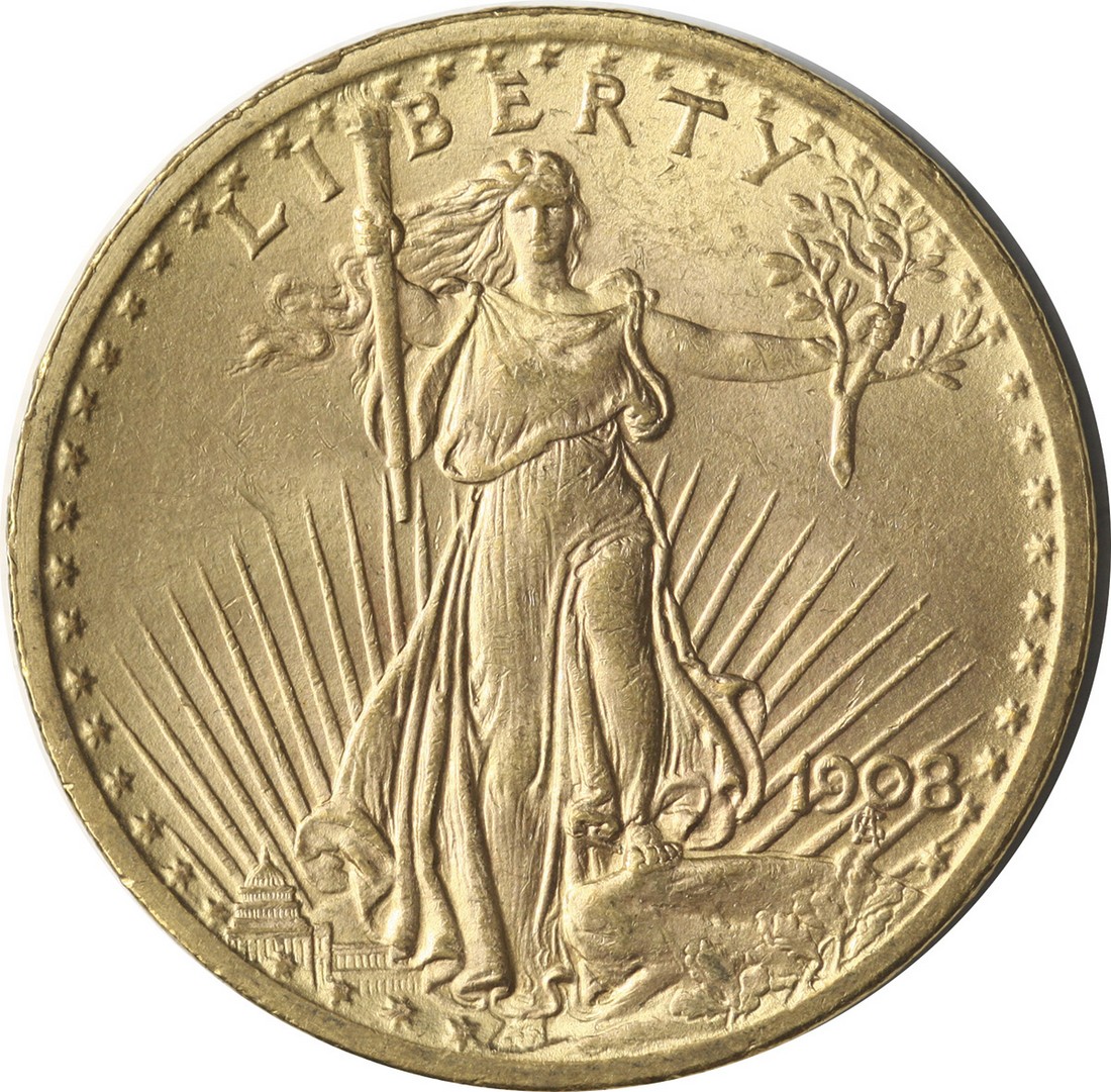 1908 No Motto $20 St. Gaudens. Choice Brilliant Uncirculated. Above average luster for the first year of this type.