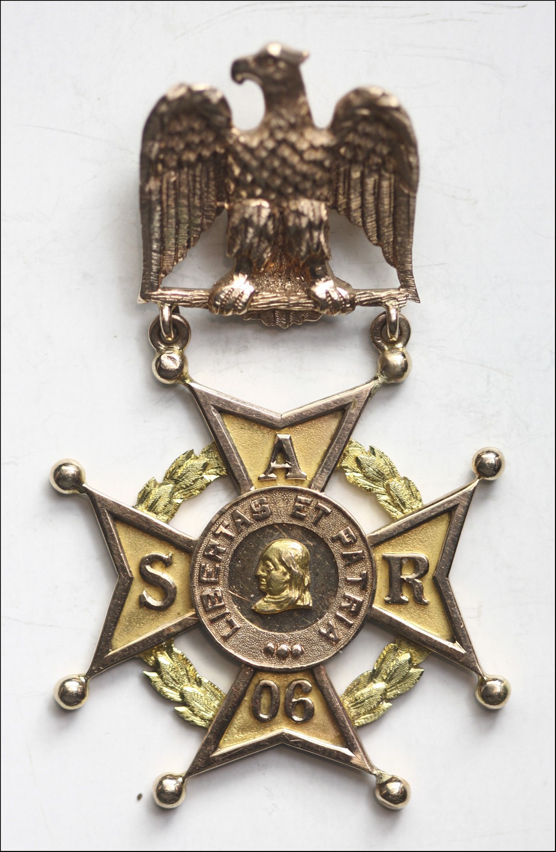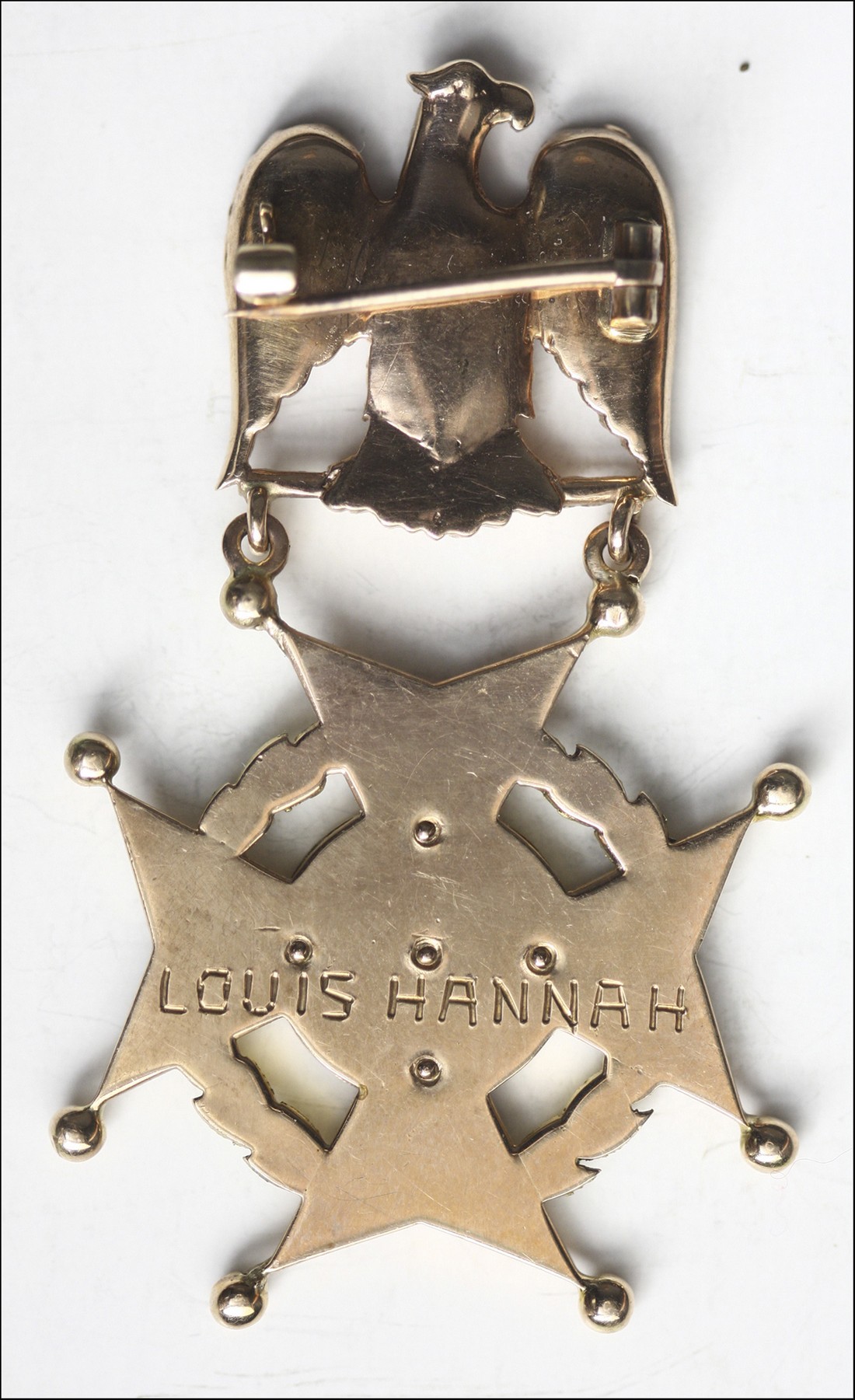 Sons of the American Revolution. Gold Badge, 1906. 51mm (from eagle), 13.07 gms. Cross with eight ball points, wreathed, suspended by eagle, Washington head l. on central badge; LIBERTAS ET PATRIA around; 'S-A-R-06' on cross arms. Engraved on back to: LOUIS HANNAH. The SAR medal designs are based on the French chivalric Order of St. Louis. A handsome piece. Extremely Fine.