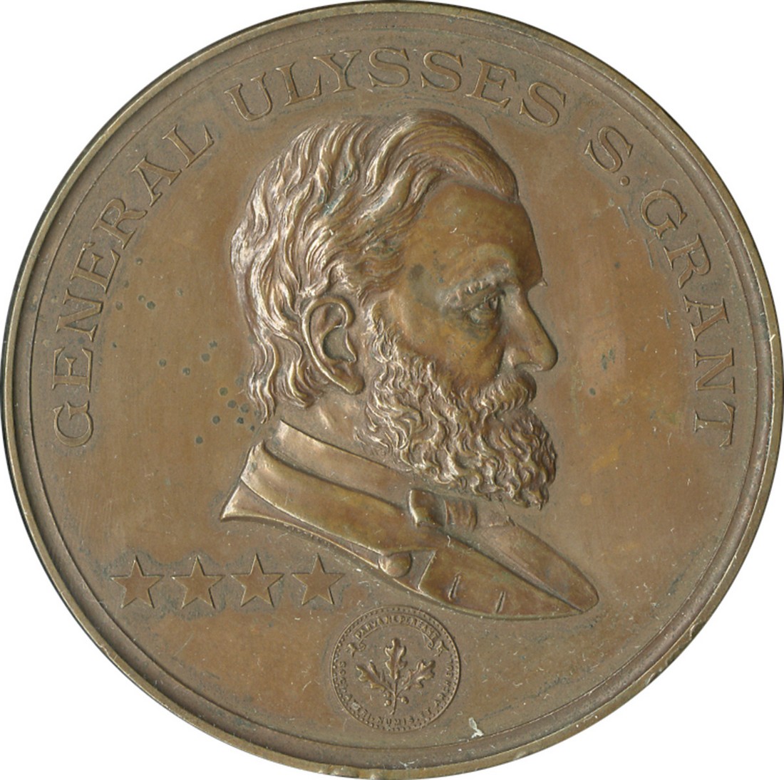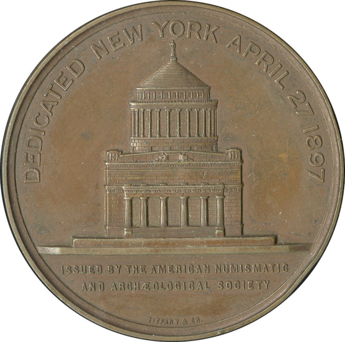 Dedication of Grant's Tomb, NY, 1897. American Numismatic Society Medal. Bronze. 63.5mm. By Tiffany & Co. Uniformed bust of U.S. Grant r. above ANS emblem, rev. Façade of the tomb, located on 122nd Street and Riverside Drive in NY City. Edge: PATENT APPLIED FOR. Small specking PVC green. Extremely Fine-About Uncirculated.