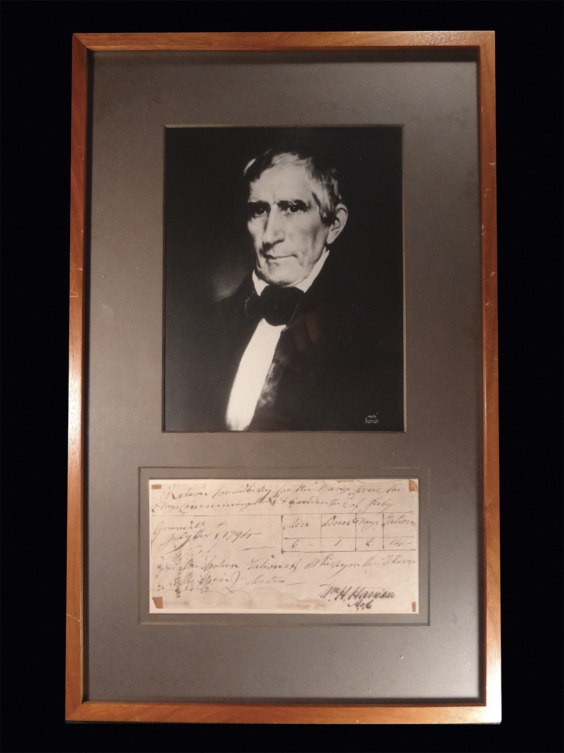 Harrison, William Henry. Ninth President of the United States (March-April, 1841). Began his military career serving in Cincinnati in the Northwest Territory during the Northwest Indian War. Gained national fame in 1811 for leading U.S. forces against Tecumseh's Native American confederacy at the Battle of Tippecanoe; served as general in the War of 1812, as Governor of Indian Territory and U.S. representative and senator from Ohio. Harrison's presidential tenure was the shortest in history for he died after only one month in office from complications resulting from pneumonia. Autograph Document Signed "Wm. H. Harrison A,d,C". Whisky Return, 8" x 3 ¾", Greenvill[e], 1 July 1794. The return is for a day's worth of whisky rations for 6 men and one woman. Harrison signs this document as the Aide-de-Camp to General "Mad Anthony" Wayne just before leaving Greenville to march against Native American forces at the Battle of Fallen Timbers in August 1794. Wayne's victory in this battle would bring the Northwest Indian War to a successful end for the United States and it would see Harrison as one of the signatories of the Treaty of Greenville. Light soiling lower margin and tab marks on corners, otherwise Very Good with clear, bold ink. Framed and matted with a black and white depiction of Harrison.