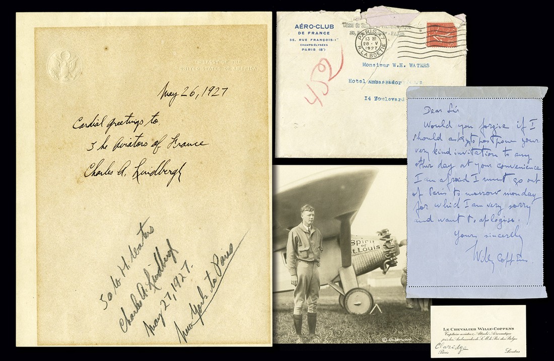 1) Original Autograph of Charles A, Lindbergh on U.S. Embassy stationary, dated May 26, 1927. Lindbergh writes: Cordial Greetings to The Aviators of France and signs "Charles A. Lindbergh" below. At the bottom of the page is Lindbergh's personal inscription to Waters: To W.H. Waters / Charles A. Lindbergh / May 27, 1927 / New York to Paris"; 2) Letter from Waters' son Billy which Lindbergh has autographed in pencil; 3) Cancelled $1,500 check which Waters used to pay for the Autograph, drawn on American Exchange Irving Trust, dated May 28, 1927 and paid to the Tresorier de la Caisse de Secours de l'Aéronautique ; 4) Program from the Gala Performance at the Théâtre des Champs-Élysées, which contains a photo of Lindbergh and facsimile of his signature; 5&6) Two Orchestre seat tickets for the Gala; 7) Lloyd's of London Insurance Policy on the Autograph insuring it against all risks in transit between Paris and New York for a value not to exceed 40,000 Francs; 8) Lloyd's Paris office receipt form for the insurance policy, dated 15 July 1927; 9) Premium for the insurance on the Autograph, for which Waters paid 415 Francs; 10&11) Salutory letter from the Caisse de Secours de l'Aéronautique, 28 May, 1927, regarding the autograph, with original envelope; 12&13) Letter from the noted Belgian ace Willy-Coppens to Waters regretting that he could not accept Waters invitation as he would be out of town along with Willy-Coppens calling card; 14) Clipping from "The American Hatter" of a two-column story on Waters' adventure meeting and getting Lindbergh's autograph; 15&16) Two copies of The New York Herald, May 29, 1927 with front page story on Gala in Honor of Lindbergh and sale of the autograph for $1,500; 17) Black and white photo by Underwood of Lindbergh standing before 'The Spirit of St. Louis'; 18) Original photo postcard of Lindbergh, leaning out aeroplane's open window; 19&20) PanAm 'Clipper' special on 50th Anniversary of Lindbergh's historic flight along with National Air and Space Museum program from the Symposium commemorating the event, May 20, 1977. Generally well-preserved, and Very Good to Very Fine. A fascinating and historic lot. [20]