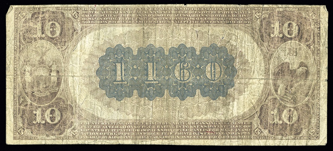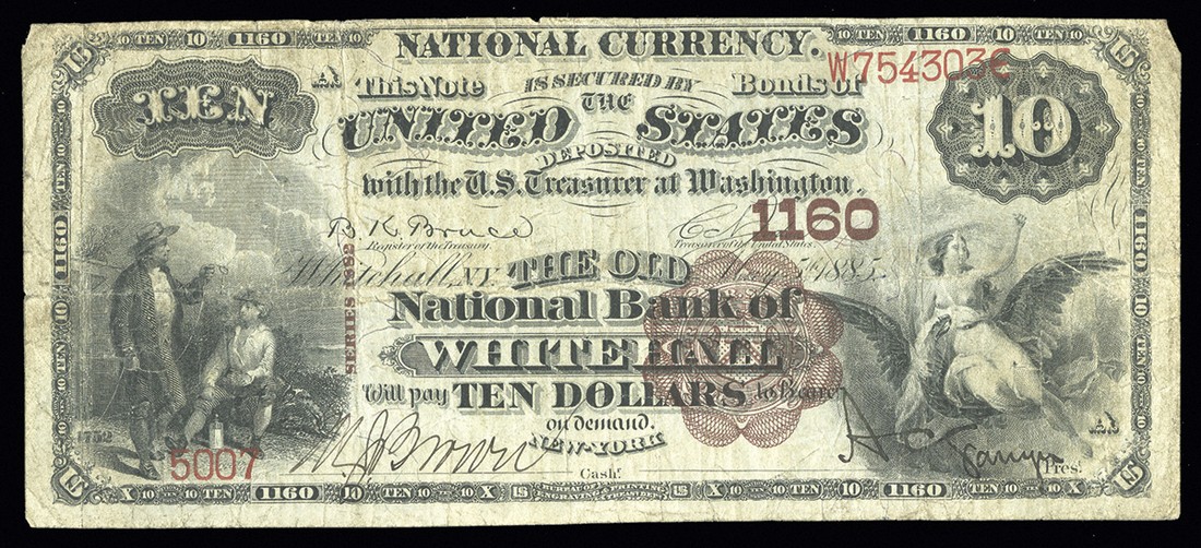 NY. New York. Ch.1160. Old National Bank of Whitehall. $10. 1882 BB. Fr. 481. No.5007 / W754303. Plate A. Fine. A bit of soiling, typical of this grade. A Fine brought $1,762.50 in a 9/13 Heritage sale.