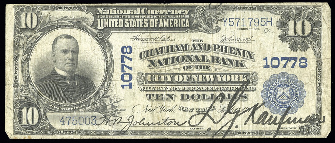 NY. New York. Ch.10778. Chatham and Phenix National Bank of the City of New York. $10. 1902 PB. Fr. 632. No.475003 / Y571795H. Plate Cc. Fine.