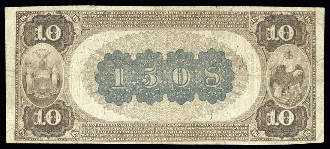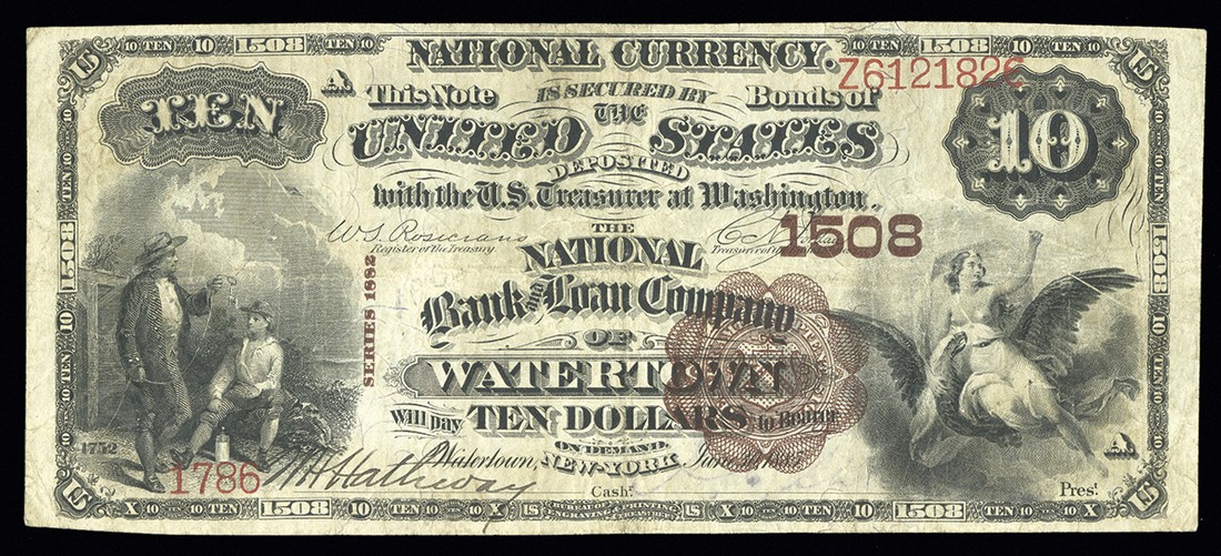 NY. Watertown. Ch.1508. National Bank & Loan Company of Watertown. $10. 1882 BB. Fr. 482. No.1786 / Z612182. Plate A. F-VF. The only $10 Brown Back reported on this Jefferson County Bank. The use of "Bank and Loan" in the title is also very unusual.
