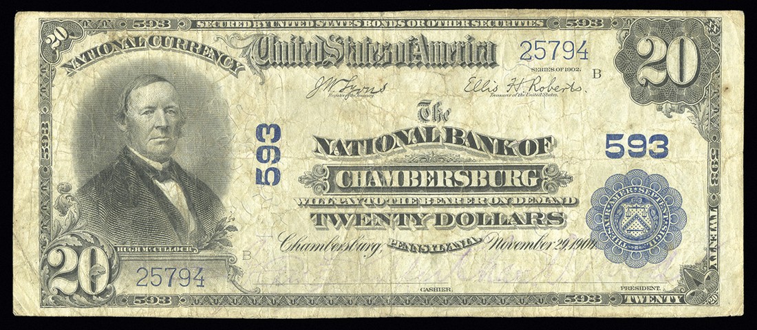 PA. Chambersburg. Ch.593. National Bank of Chambersburg. $20. 1902 PB. Fr. 650. No.25794. Plate B. Fine.