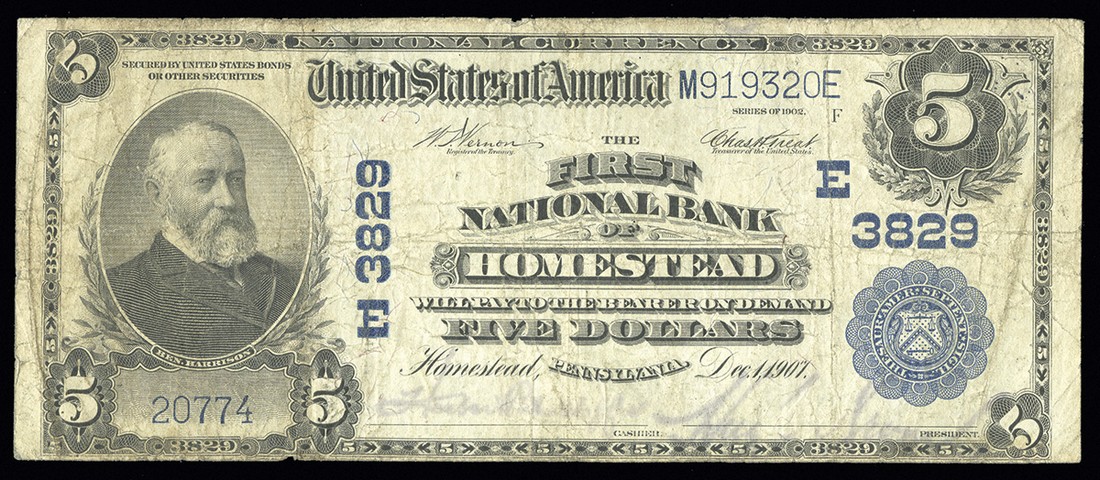 PA. Homestead. Ch.3829. First National Bank of Homestead. $5. 1902 PB. Fr. 600. No.20774 / M919320E. Plate F. F. Light stains, trivial pinholes. Signatures faded somewhat.