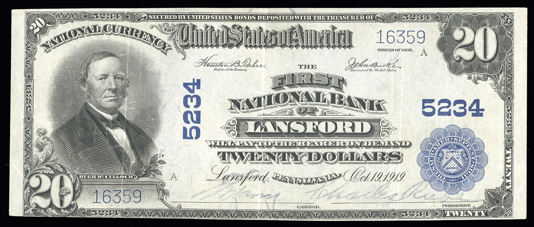 PA. Lansford. Ch.5234. First National Bank of Lansford. $20. 1902 PB. Fr. 658. No.16359. Plate A. VF-EF. Only one other $20 of this type is reported, and this is by far the finest.