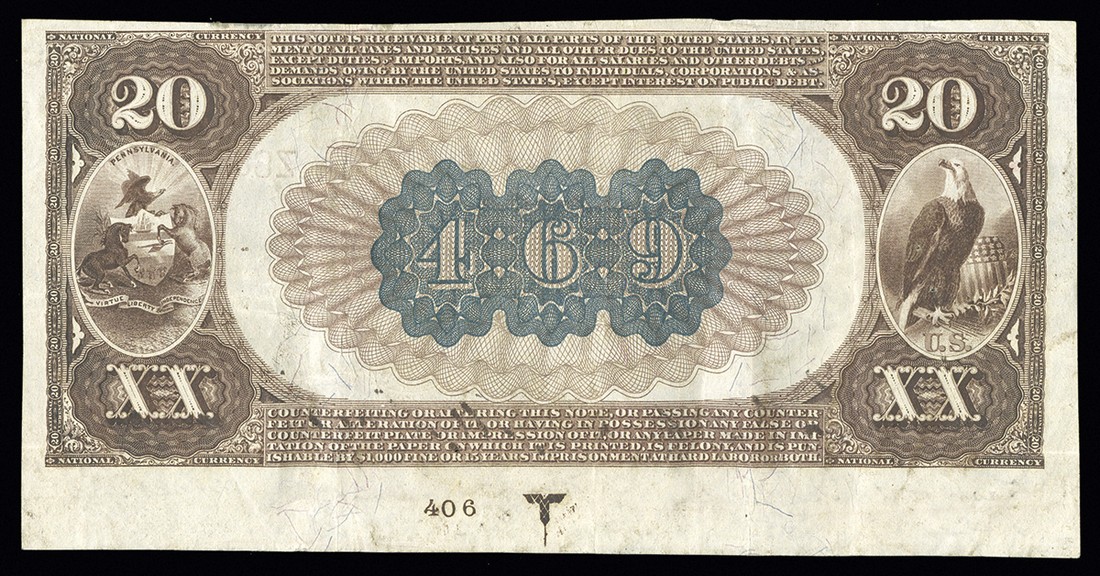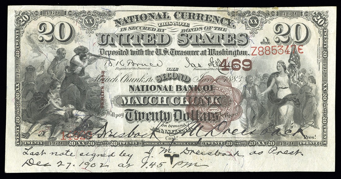 PA. Mauch Chunk. Ch.469. Second National Bank of Mauch Chunk. $20. 1882 BB. Fr. 493. No.14929 / Z885347. Plate A. EF-AU. Similar to the previous note, with "Last note signed by J. M. Dreisbach as Prest. Dec 27, 1902 at 1:45 PM" in the generous bottom margin.