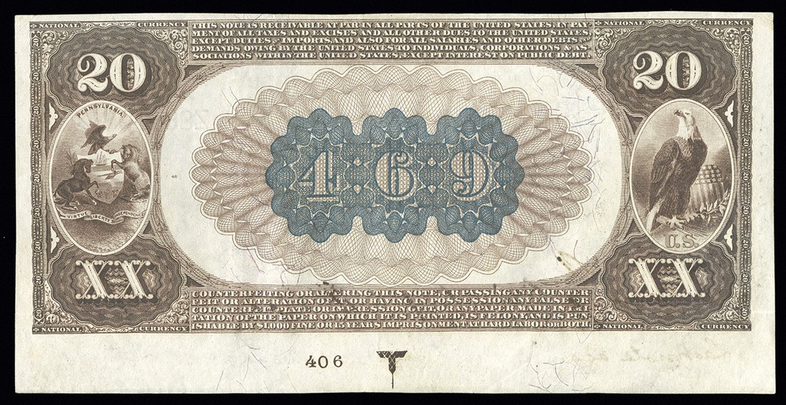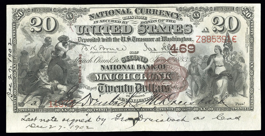 PA. Mauch Chunk. Ch.469. Second National Bank of Mauch Chunk. $20. 1882 BB. Fr. 493. No.14973 / Z885391. Plate A. Almost Uncirculated. With one horizontal fold just above the bottom border. "Dec 27, 1902" is in the left margin, written in black ink. "Last note signed by George Dreisbach as Cas (SIC) Dec 27, 1902" appears in the generous bottom margin. This note, and the following example, are the only known $20 Brown Backs on this Carbon County bank.