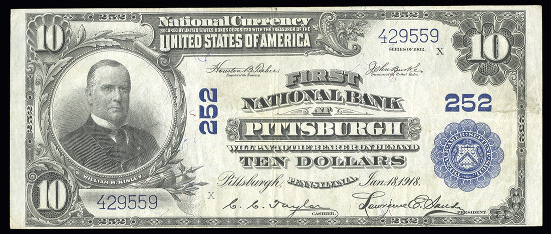 PA. Pittsburgh. Ch.252. First National Bank at Pittsburgh. $10. 1902 PB. Fr. 632. No.429559. Plate X. F-VF. Fresh and bright, with the look of an Extremely Fine example. Third Title.