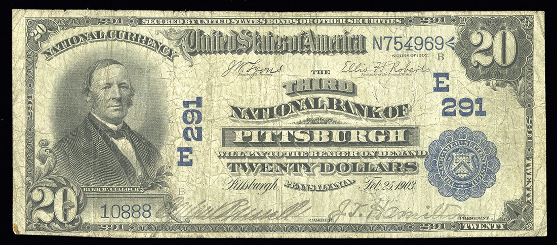 PA. Pittsburgh. Ch.291. Third National Bank of Pittsburgh. $20. 1902 DB. Fr. 642. No.10888 / N754969. Plate B. VG. Soiling commensurate with the grade.