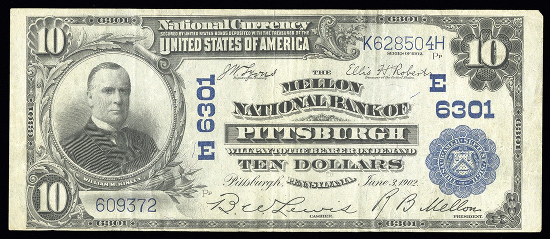 PA. Pittsburgh. Ch.6301. Mellon National Bank of Pittsburgh. $10. 1902 PB. Fr. 624. No.609372 / K628504H. Plate Pp. VF. A perfect "type note" for the grade.