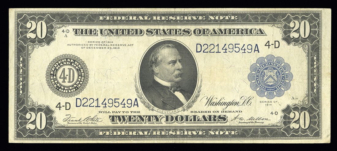 Fr.979a. $20. Federal Reserve Bank. 1914. Grover Cleveland. Cleveland. No.D22149549A. Plate A. VF.
