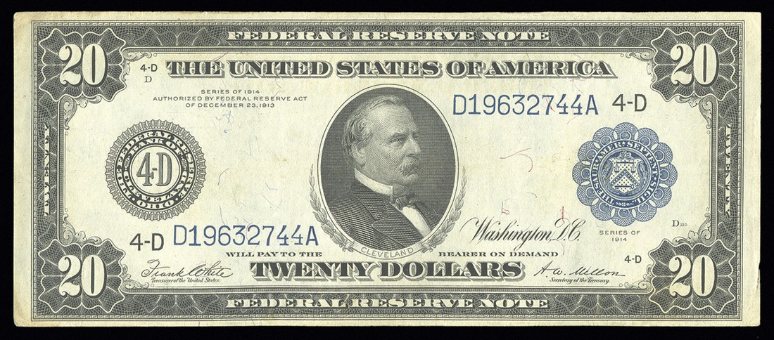 Fr.979A. $20. Federal Reserve Bank. 1914. Grover Cleveland. Cleveland. No.D19632744A. Plate D. EF-AU. Lighty pressed.