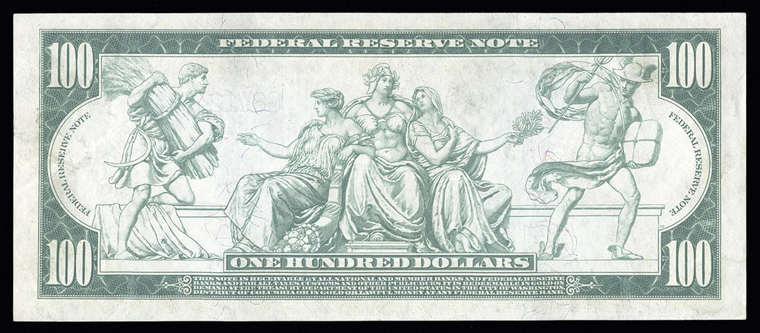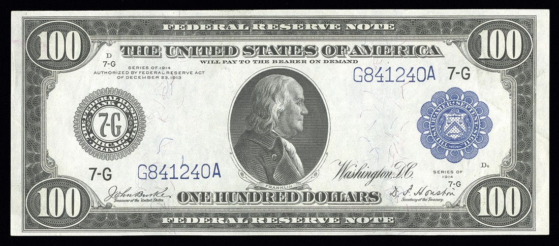 Fr.1110. $100. Federal Reserve Bank. 1914. Benjamin Franklin. Chicago. No.G841240A. Plate D. EF-AU. Fresh and bright, with vivid blue serial numbers and seal.