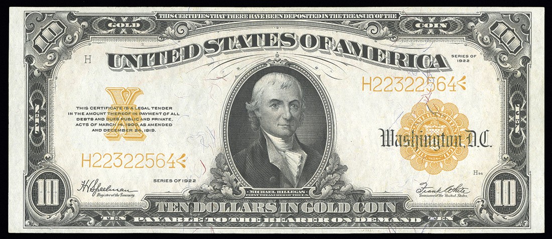 Fr.1173. $10. Gold Certificate. 1922. Michael Hillegas. No.H22322564. Plate H. Very Choice Uncirculated.