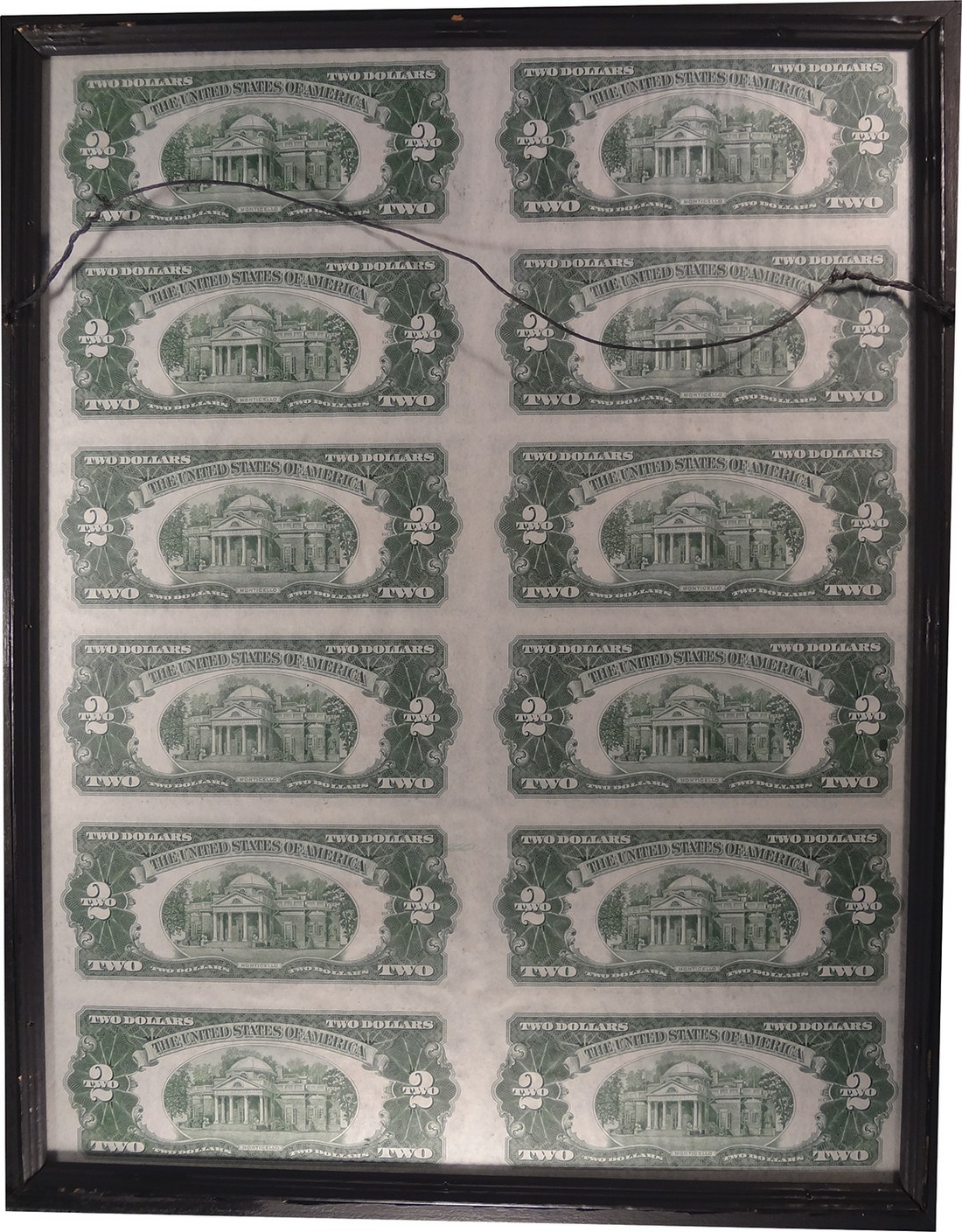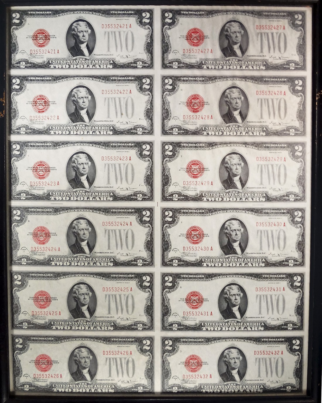 Uncut Sheet of Twelve $2 1928E Legal Tender Notes. Fr.1506. No.D35532421A-2432A. Framed. The sheet is floating between two sheets of glass, with both sides visible. Uncirculated.
