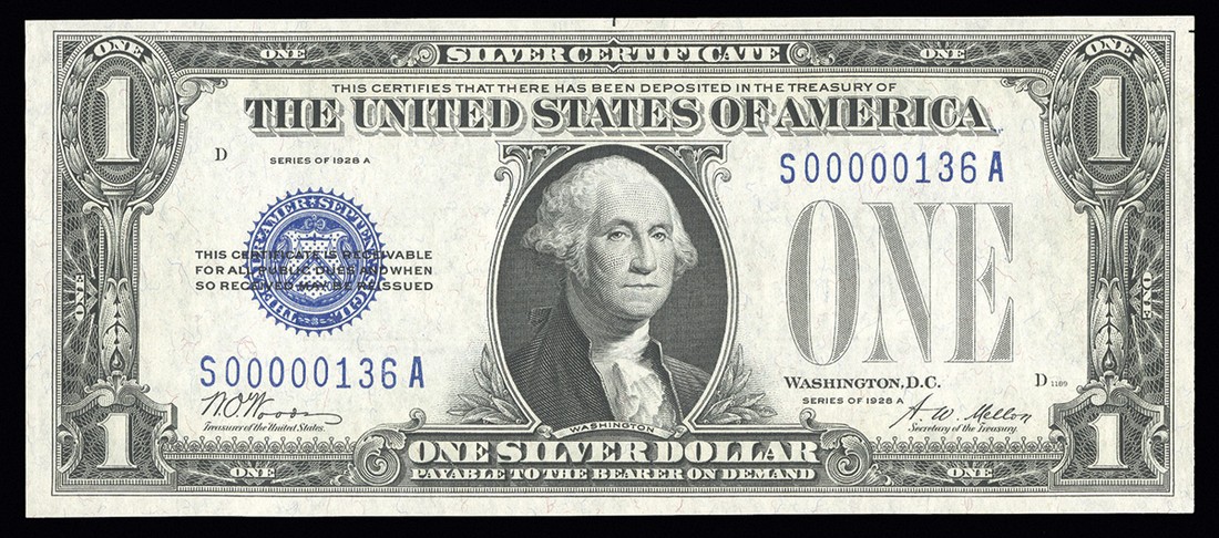 Fr.1601. $1. Silver Certificate. 1928A. No.S00000136A. Plate D. Choice Uncirculated.