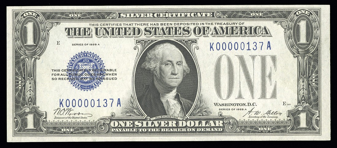 Fr.1601. $1. Silver Certificate. 1928A. No.K00000137A. Plate E. Choice Uncirculated.
