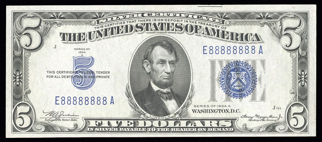 Fr.1651. $5. Silver Certificate. 1934A. No.E88888888A. Plate J. Choice Uncirculated. Chinese tradition considers eight to be a very lucky number, perhaps because the Chinese word for eight sounds similar to Chinese words that mean fortune or prosperity. This example has a serial number comprised of eight 8's; it just doesn't get any better for a paper money collector who believes in the ancient Chinese tradition of lucky eights! Very rare, especially on early small size $5 Silver Certificates.
