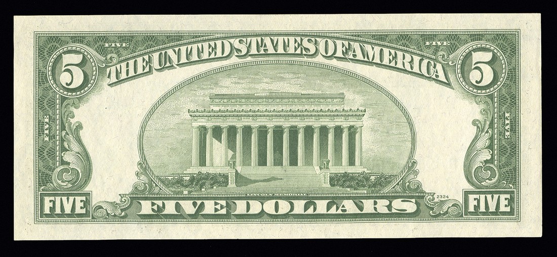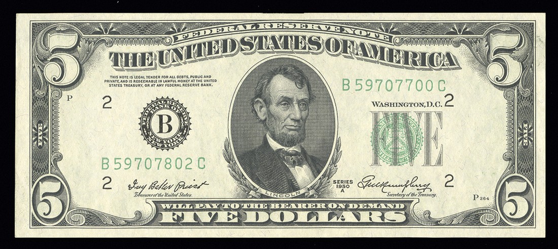 Fr.1962-B. $5. Federal Reserve Note. 1950A. Mismatched serial numbers. No.B59707802C / B59707700C. Plate P. Choice Uncirculated. The upper right serial numbering device apparently froze at 700C. A similar note with a 808C / 700C mismatched appeared in a January 2006 Heritage auction and realized $632.50.