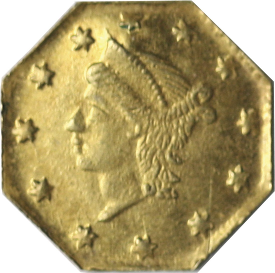 California Fractional Gold. 1856 Liberty Head Octagonal Quarter Dollar. BG-111 (R-3). Brilliant Uncirculated in terms of wear. A small reverse contact mark at 6:00 has caused a slight bulge at 12:00 inside the obverse rim.