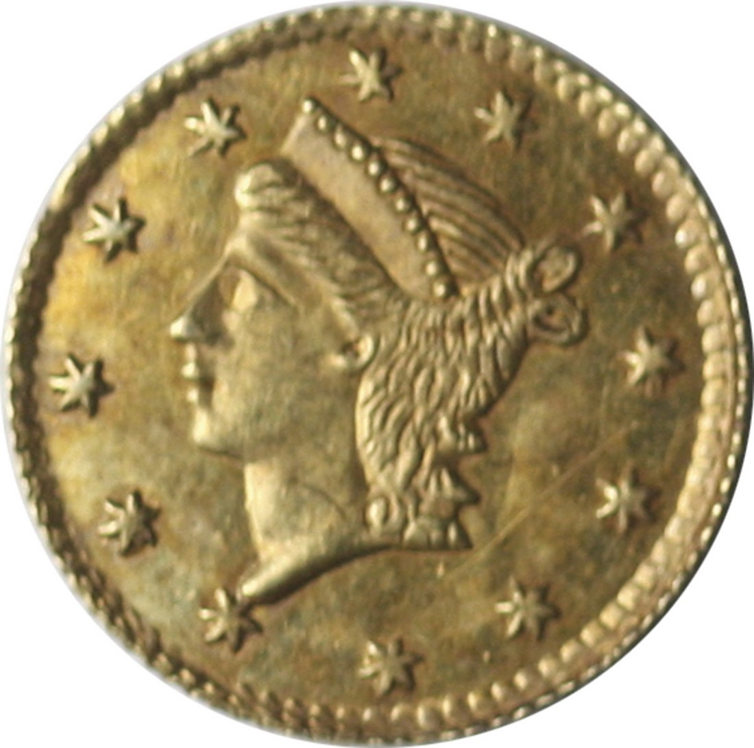 California Fractional Gold. No Date (c.1854) Liberty Head Round Quarter Dollar. BG-224 (R-3). Brilliant Uncirculated details and approaching the Choice category at first glance. There is, however, a hairline scratch in the lower left obverse field.