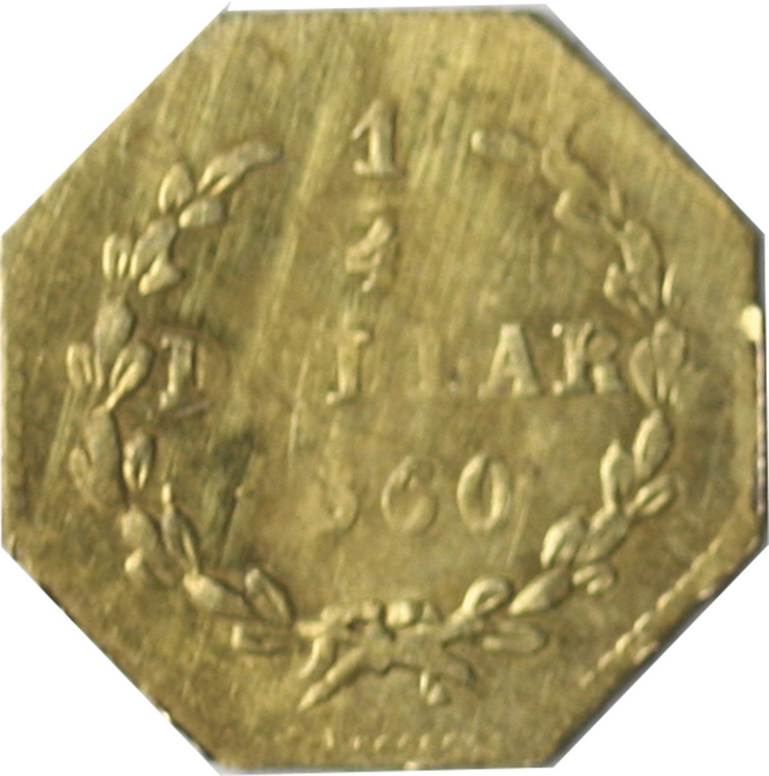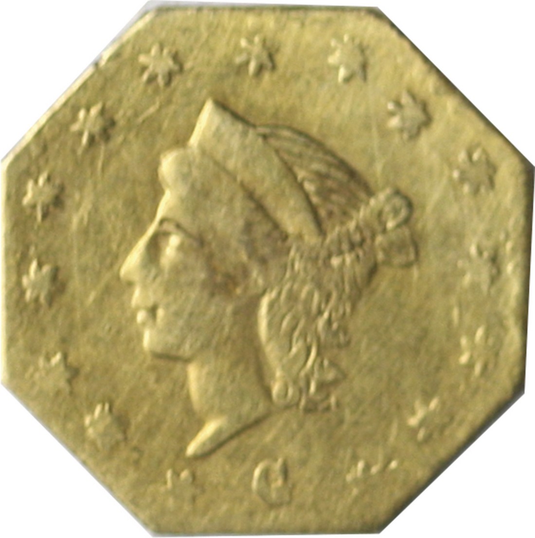 California Fractional Gold. 1860 Liberty Head Octagonal Quarter Dollar. BG-731 (Low R-5). About Uncirculated with respect to wear. The strike however, is not full, and the surfaces have sustained rather noticeable hairlines from a past cleaning on either side.