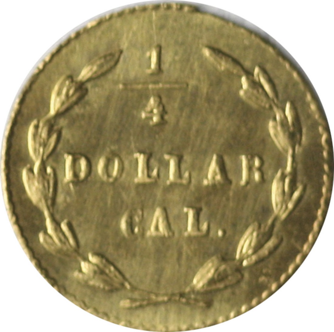 California Fractional Gold. No Date (1870-1871) Liberty Head Round Quarter Dollar. BG-834 (High R-5). An interesting transitional issue in that there is no date (the coins dated 1870 struck from this obverse die and maker bore the date on the reverse, and the reverse employed here was used on both this issue as well as other varieties dated 1871 on the obverse). Choice Brilliant Uncirculated in terms of initial appearance. Closer examination, however, indicates the presence of some deceptive hairlines. Quite scarce and of importance to collectors within this specialty.