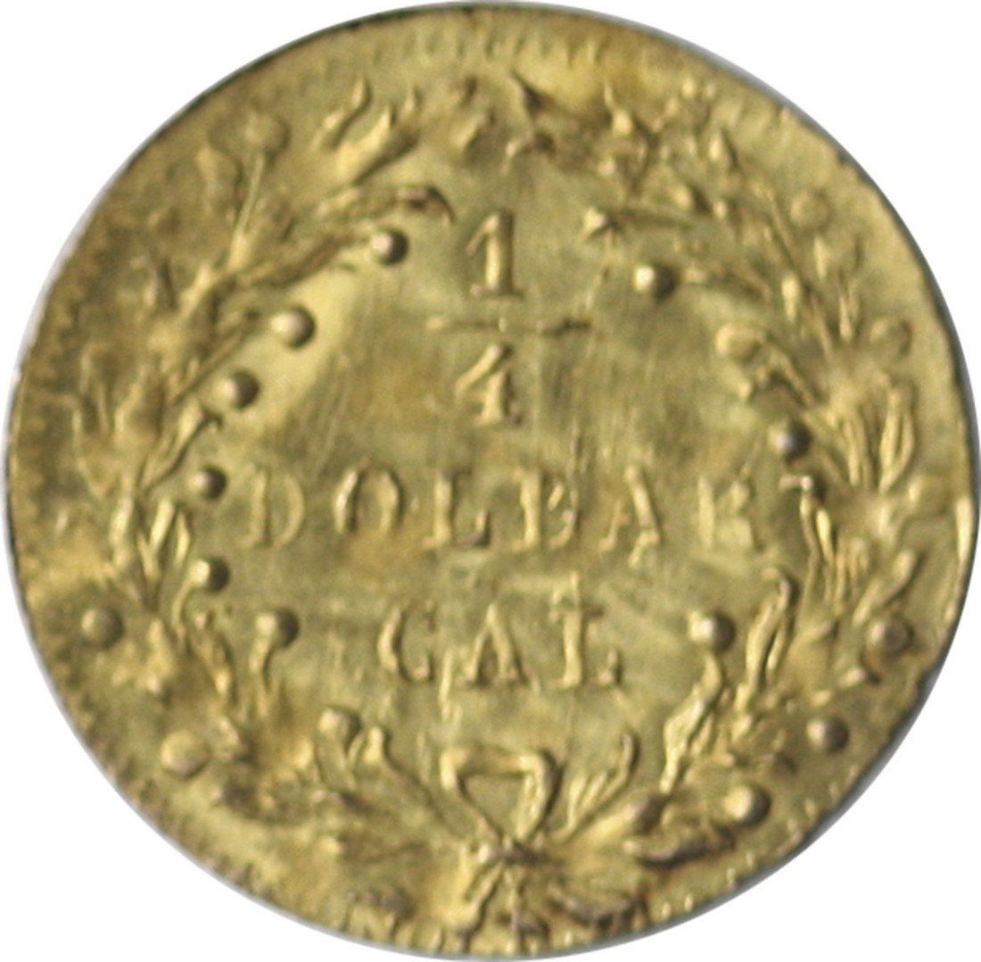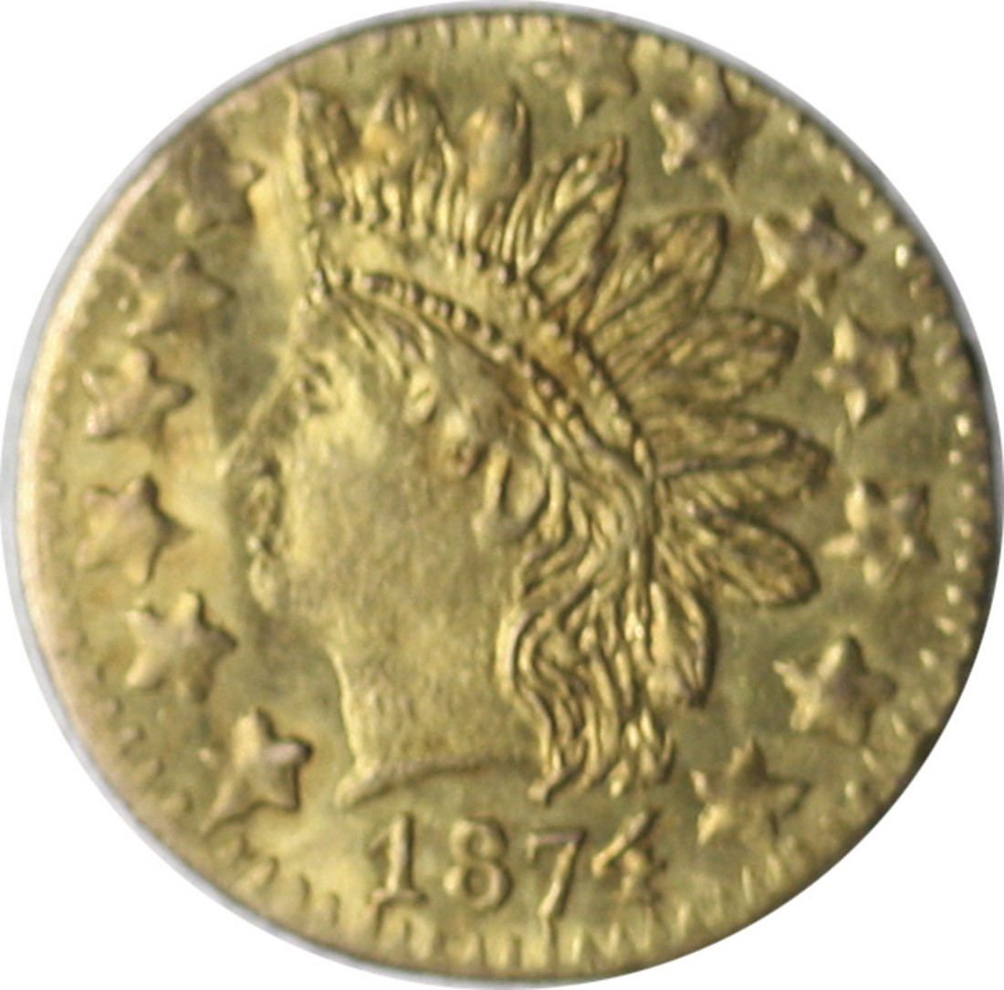 California Fractional Gold. 1874 Indian Head Round Quarter Dollar. BG-876 (R-4). Brilliant Uncirculated and just bordering on a fully Choice distinction. Well struck central definition and a full measure of frosty mint luster characterize this example.