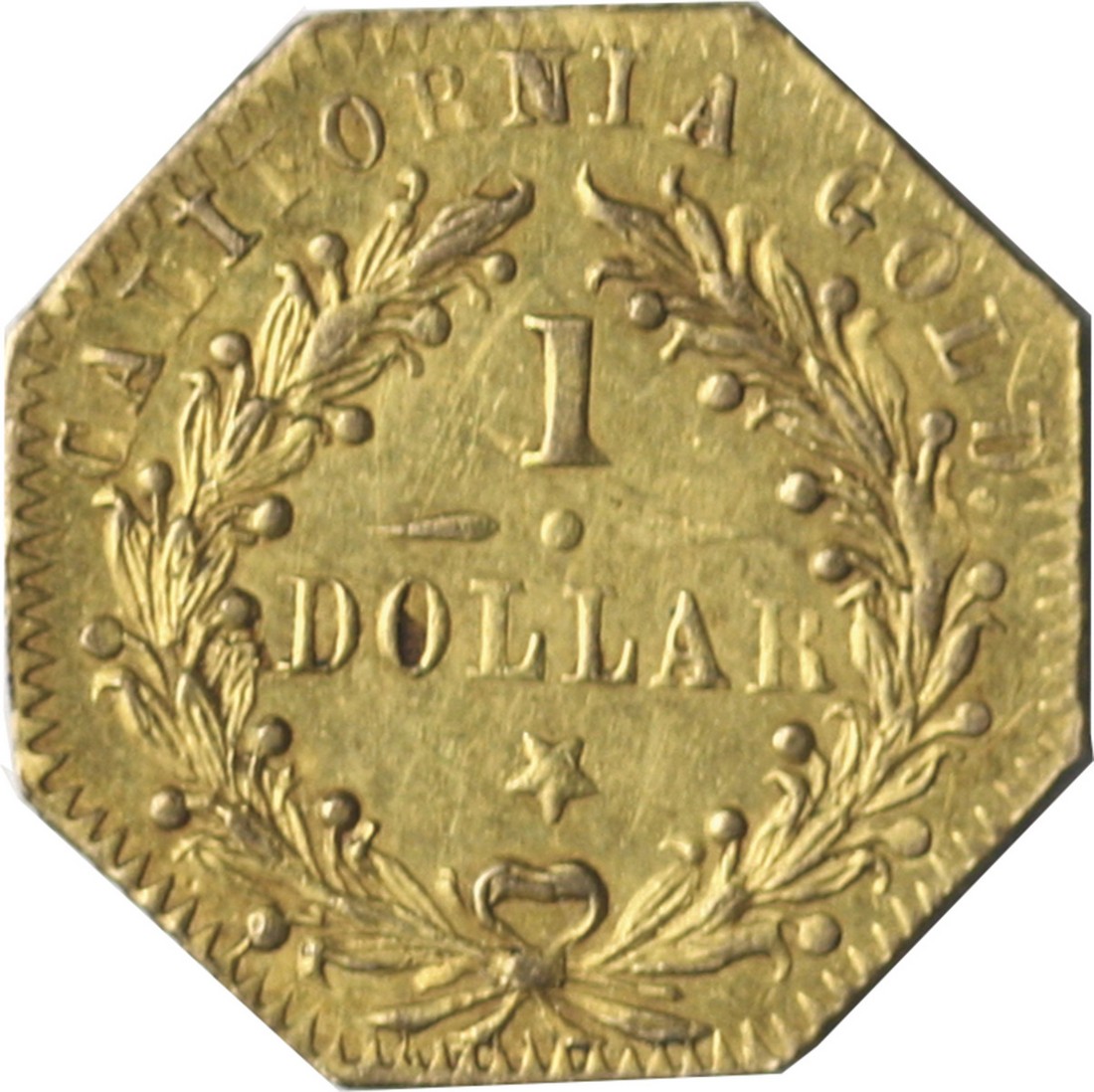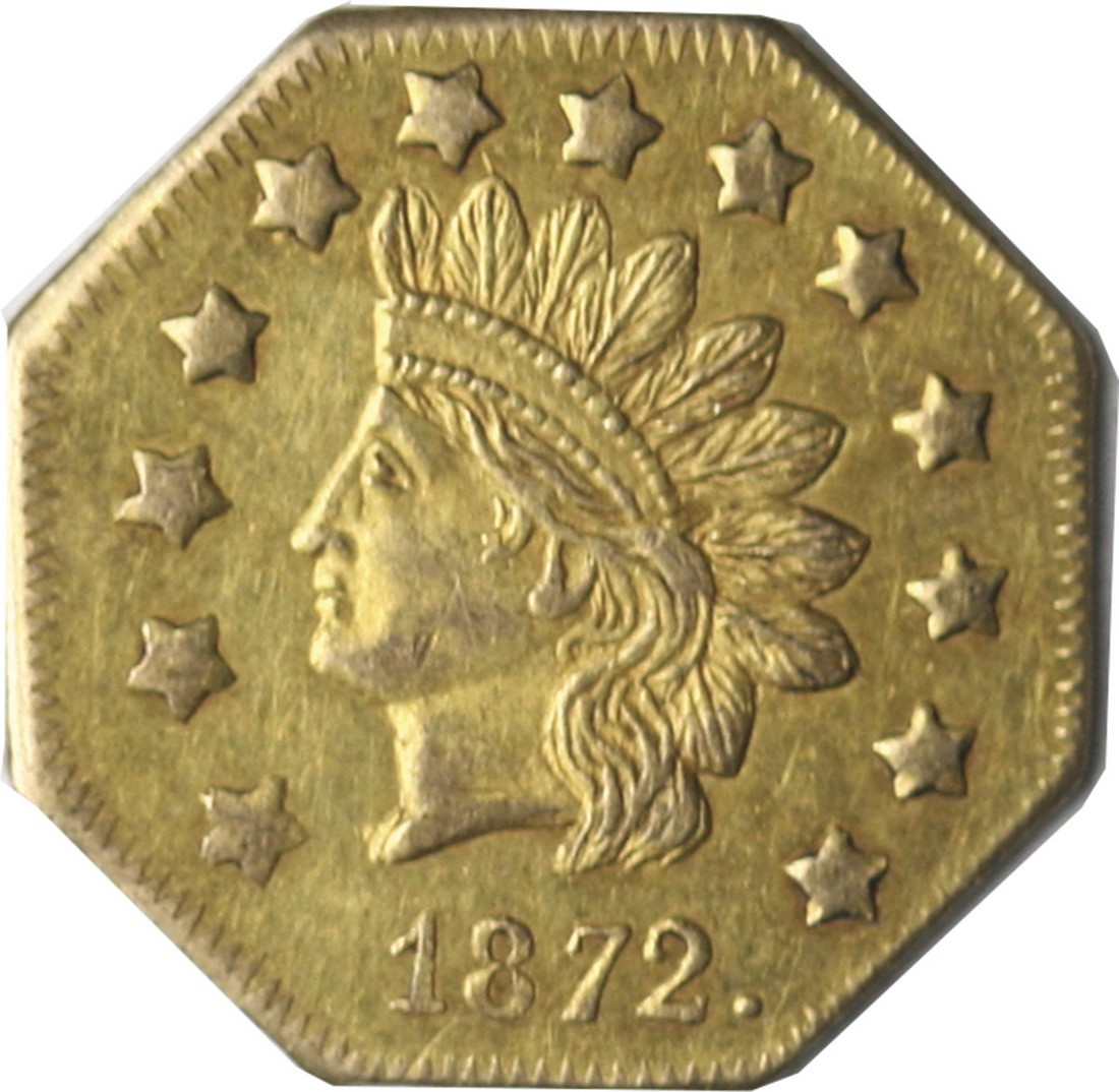 California Fractional Gold. 1872 Indian Octagonal Dollar. BG-1120 (Low R-5). About Uncirculated and enjoying wholesome, semi-reflective surfaces on both the obverse and reverse. A highly satisfying, delicate greenish-golden example that is sure to please its new purchaser.