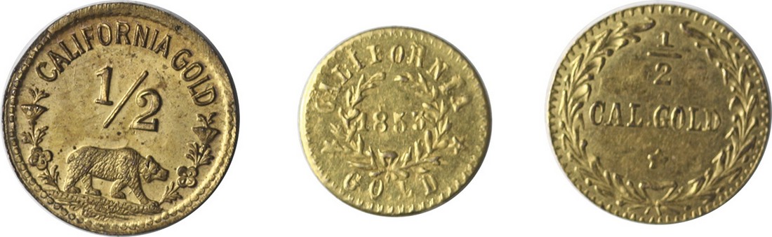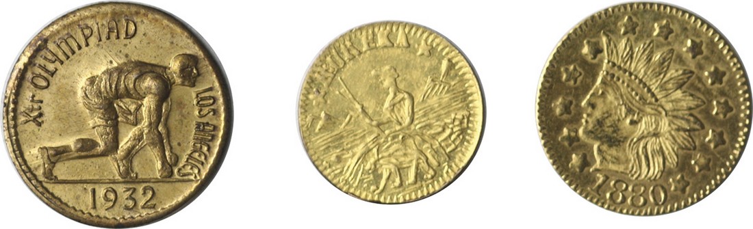 Balance of consignment lot of California Fractional Gold related items including: (1880) ½ CAL GOLD round Indian Head charm. BU, presumably gold and appearing to be of a somewhat earlier origin; (1853) round EUREKA token. BU and of a ¼ dollar size; 1932 Los Angeles Olympics ½ round California Gold Souvenir token. BU. A total of 3 coins.