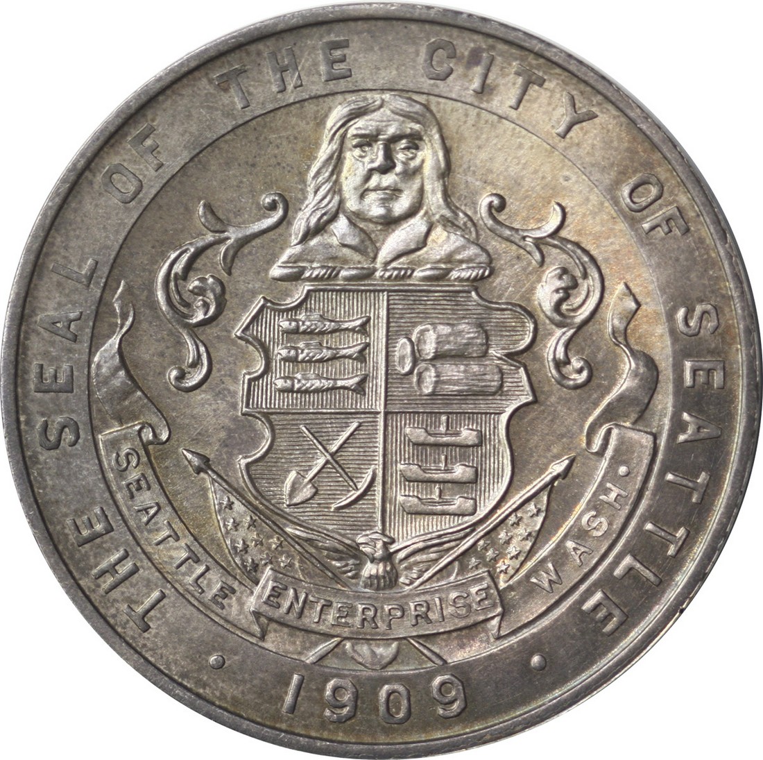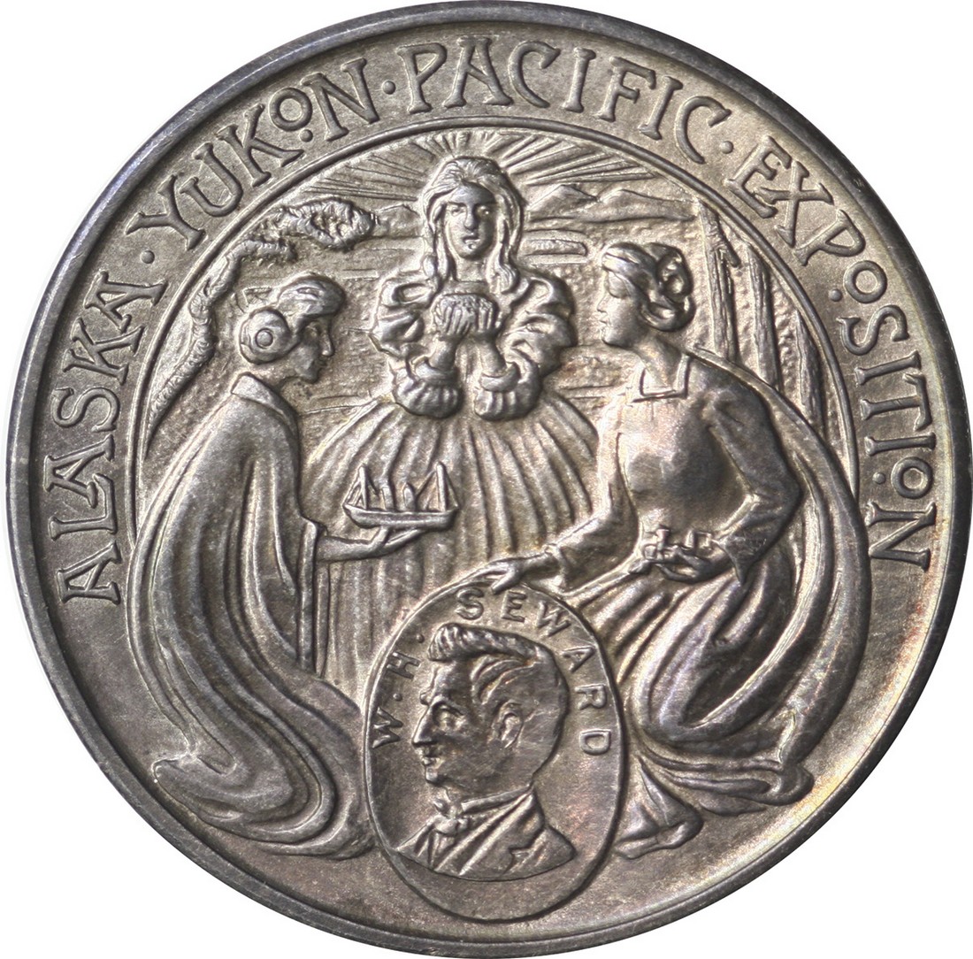 1909 Alaska-Yukon-Pacific Exposition - Seattle. HK-353. Silver. 15.3 grams. Three female figures. City seal on the reverse. Very Choice Uncirculated. Evenly toned on both sides.