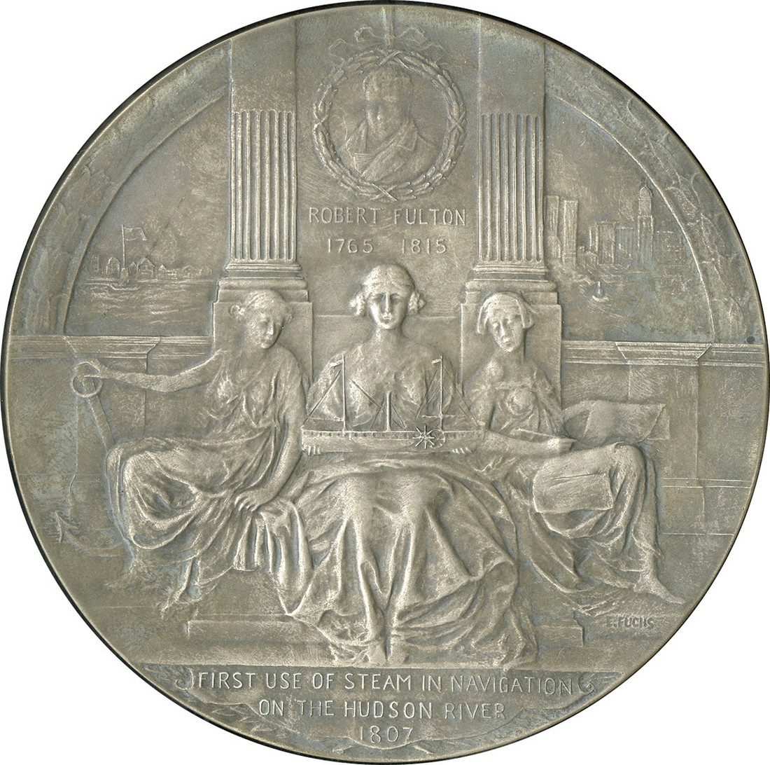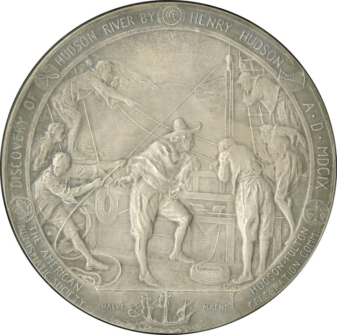 1909 Hudson-Fulton Large Size Silver Medal with the original box as issued in Commemoration of the Hudson-Fulton Tercentennial Celebration. Sterling Silver, 101 mm. Struck by Whitehead & Hoag, this extremely rare, large format silver medal almost never reaches the market, particularly with its original brown leather box of issue. Inscribed "HUDSON-FULTON/ CELEBRATION/1909" in small block letters at the center of its lid, the box is fully functional and exhibits moderate wear most notable around its sides. The medal itself grades a lovely Very Choice Uncirculated; its antique-matte finish being almost entirely unencumbered by any flaws of consequence. Lovely pale to medium grey surfaces are framed by hints of lilac-golden peripheral iridescence. A highly unusual opportunity to acquire this historic medal. In fact, we urge prospective bidders to not take this appearance lightly, as it may be many years indeed before such an item reaches the auction block again! Only 100 such pieces are believed to have been struck in this format.