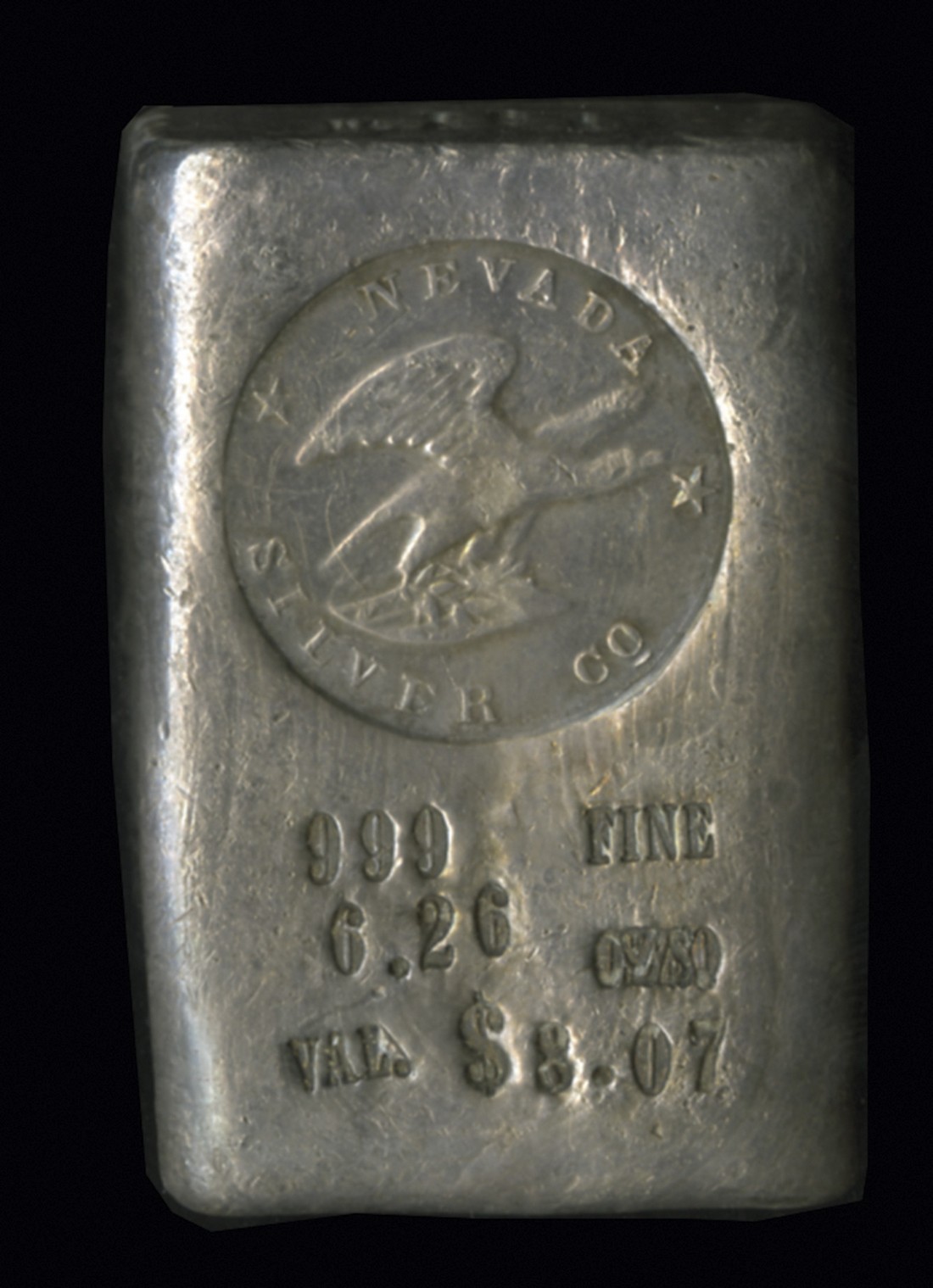 Nevada Silver Company Ingot. Undated, 6.26 ounces, .999 Fine. The circular imprint of the Nevada Silver Company is featured at the upper obverse followed vertically by: 999 FINE/ 6.26 OZS (errantly imprinted first upside down)/ VAL. $8.07. The upper edge is also imprinted "No. 261". Smooth, pleasing, and exhibiting a nice pale grey hue with subtle golden undertones. Operating out of Rawhide, Nevada, this company was active from 1919 until its eventual demise in 1932. Poetically, the town of Rawhide no longer exists, and is now the sight of one of the largest open pit gold mines in the United States. The elusive ingots of this long defunct silver marketing endeavor appear at auction quite sparingly, and are eagerly gobbled up by collectors of early ingots.
