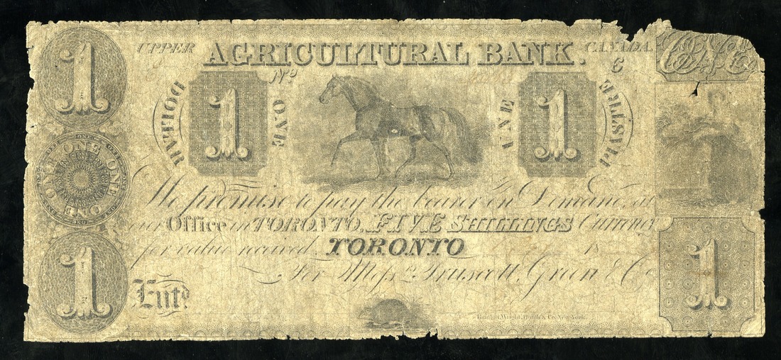 Canada. The Agricultural Bank, Toronto pair: 1 Dollar (5 Shillings) and 2 Dollars (10 Shillings). 1834. Ch.20-10-02 and -10-06. Horse trotting left, beaver below; Beehive, sheaf, cornucopiae, spinning wheel - beaver below, men with livestock in round frames left and right. The first Good, corner pull, tiny pinholes; the latter F-VF, upper edge nick, ink moderately faded, but most legible. [2]