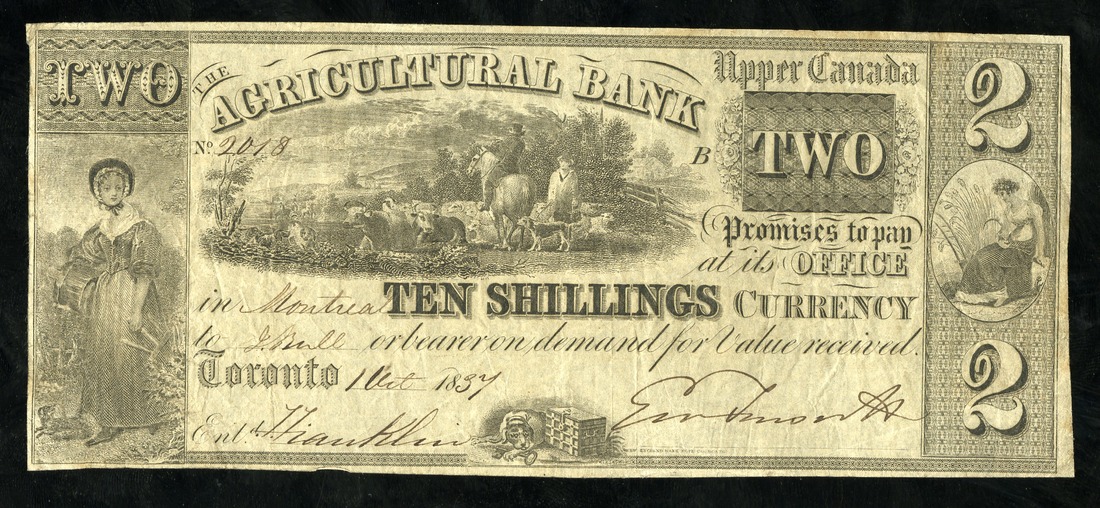 Canada. The Agricultural Bank, Toronto. 2 Dollars. 1837. Ch.20-12-04-04. Pastoral scene upper center, dog with key by strongbox below, milkmaid at left, seated female with sickle at right. Pen writing strong and clean, full margins. Good Fine-VF, presents well.
